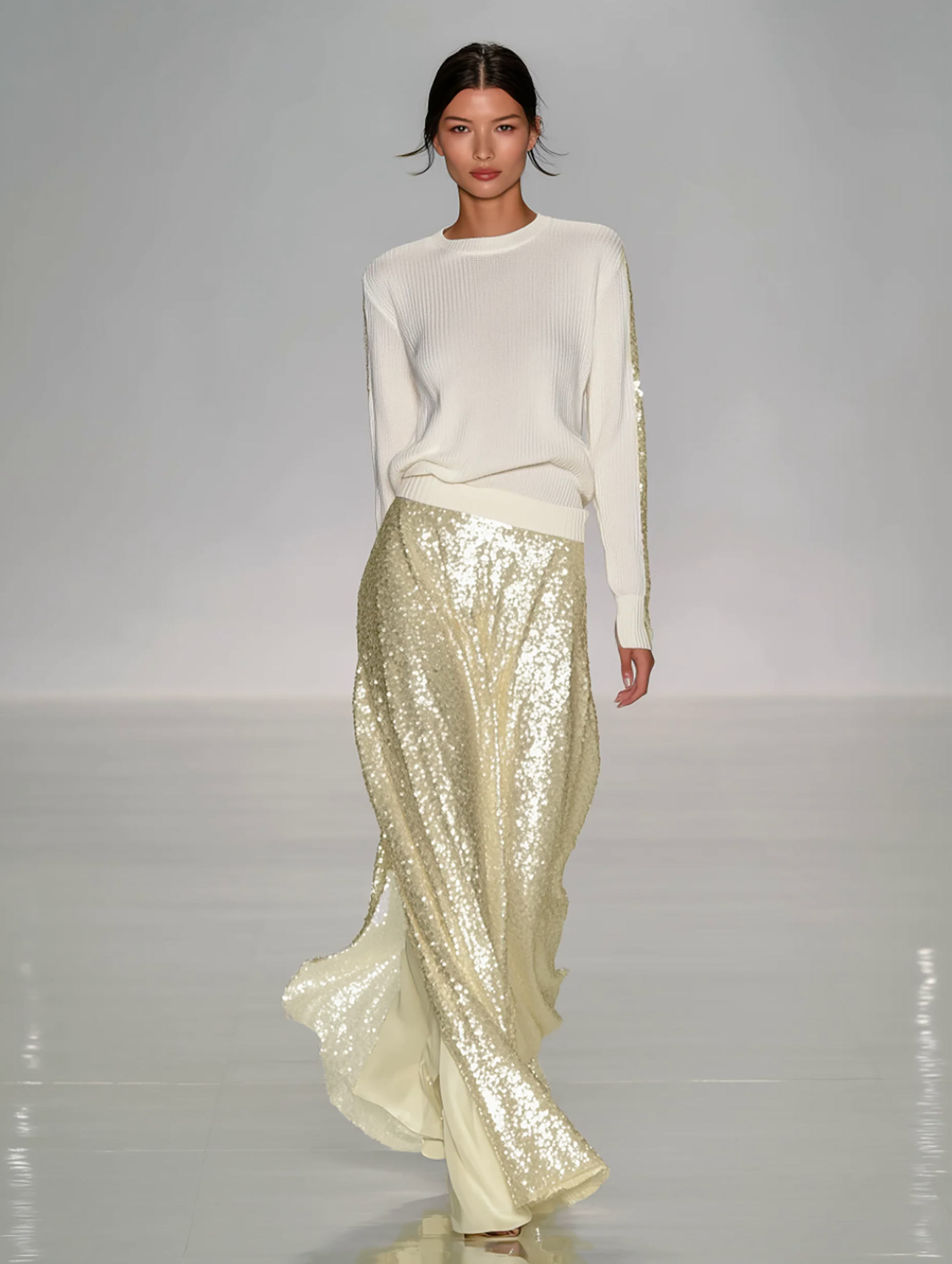 Enhance your wardrobe with this versatile and elegant ensemble. The knitted top ensures comfort, while the sequined skirt adds a dazzling effect. Perfect for any fashion-forward woman looking to make a statement.