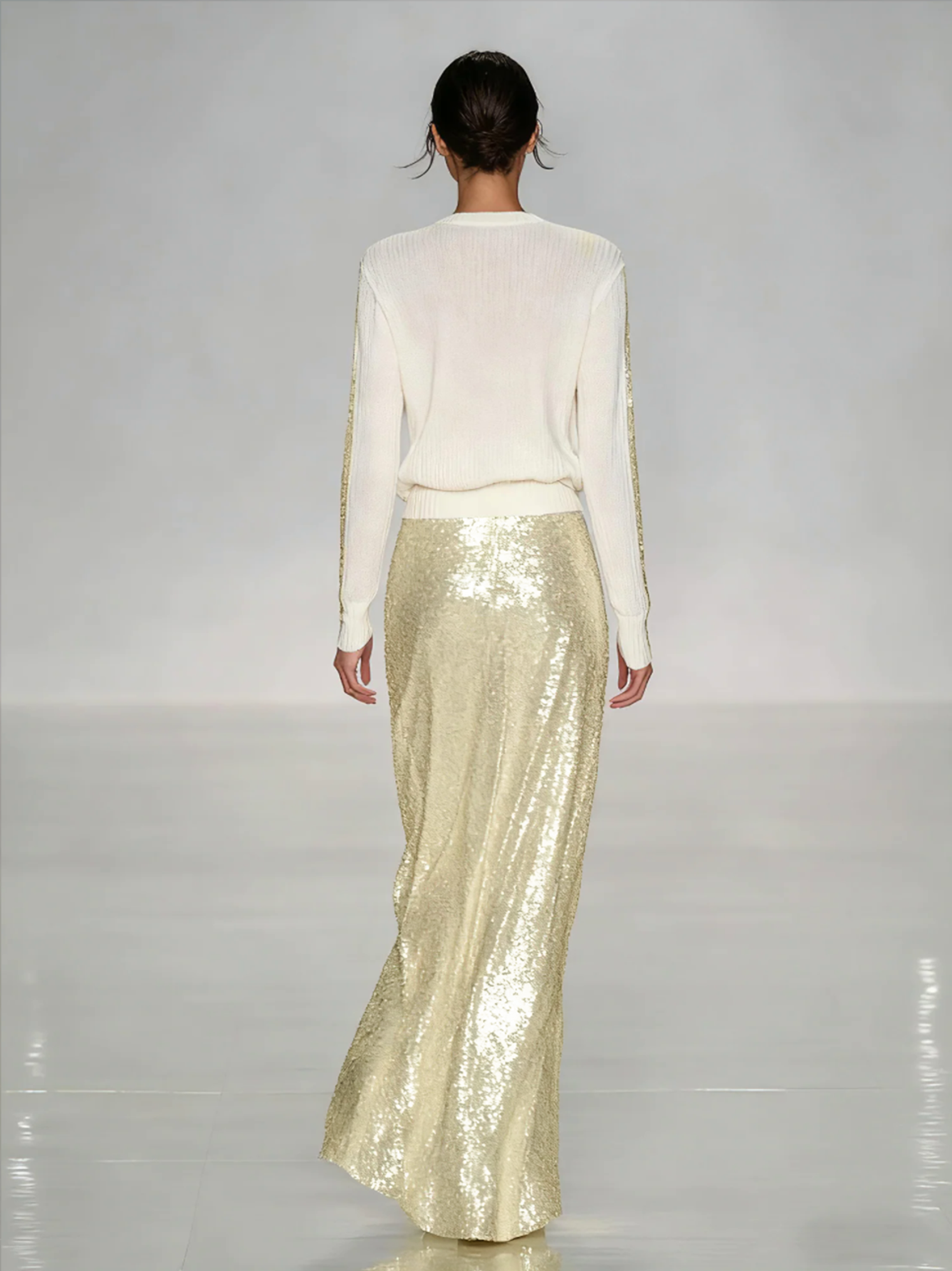 Enhance your wardrobe with this versatile and elegant ensemble. The knitted top ensures comfort, while the sequined skirt adds a dazzling effect. Perfect for any fashion-forward woman looking to make a statement.