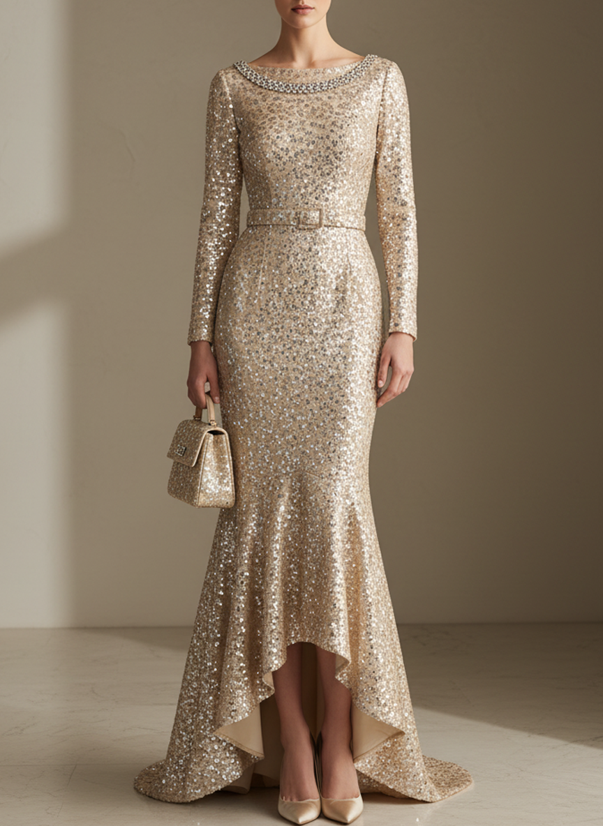 This Women's Fashionable Casual Round Neck Knitted Top With Sequined Long Skirt Suit is a stylish and elegant ensemble perfect for a variety of occasions. The set features a soft and comfortable knitted top with a classic round neck design, paired with a stunning sequined long skirt that shimmers with every movement.