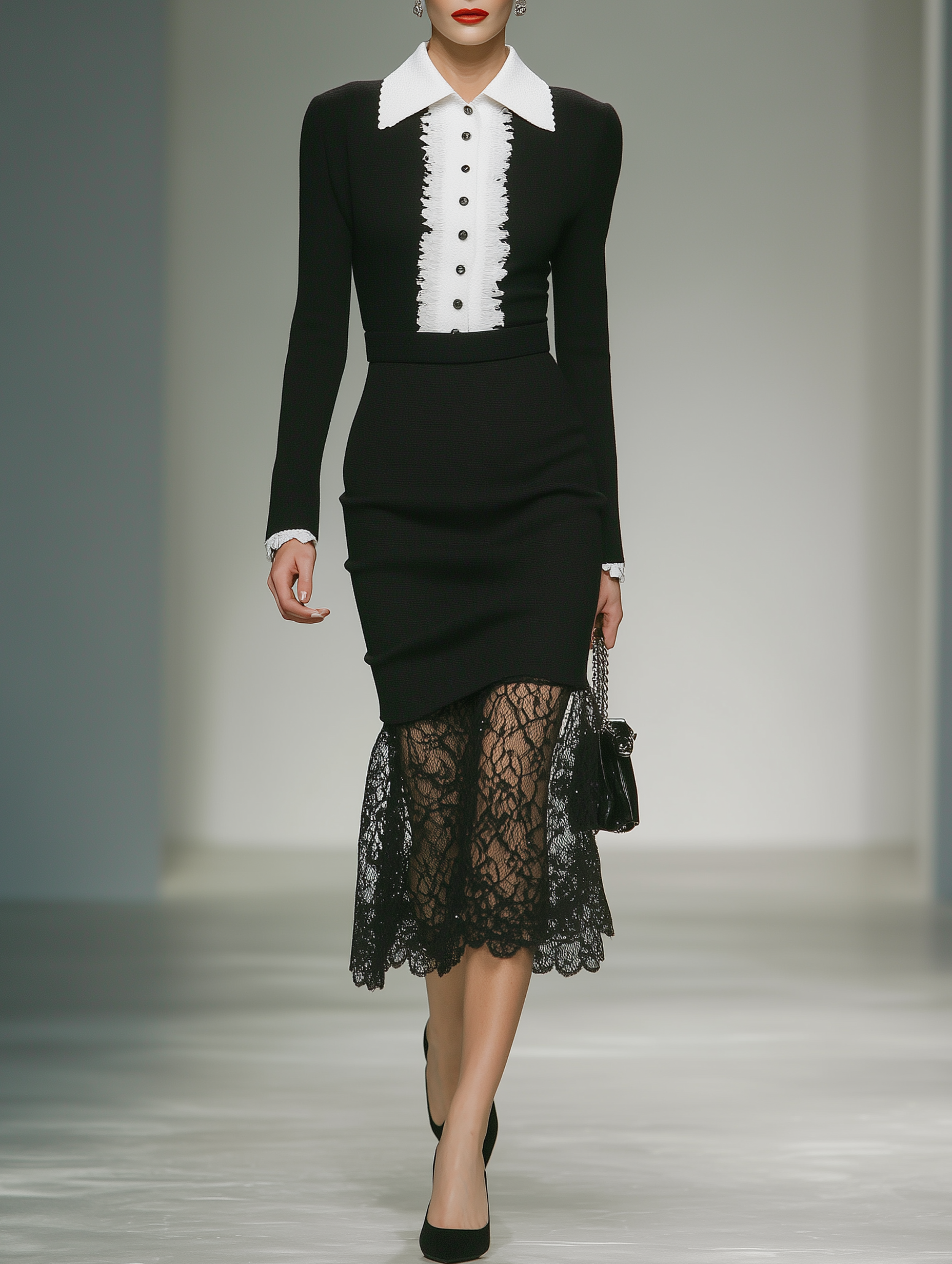 Women's Retro Color-Blocked Lace Patchwork Top And Fishtail Skirt Two-Piece Set