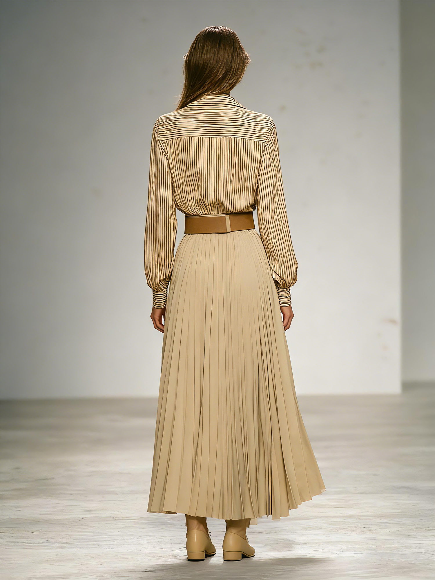 Women's Casual Khaki Shirt And Pleated Skirt Set