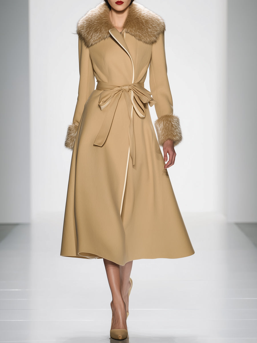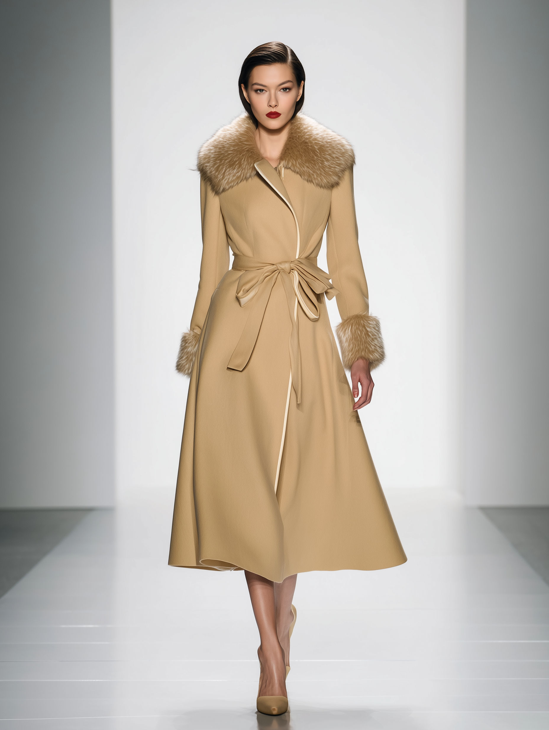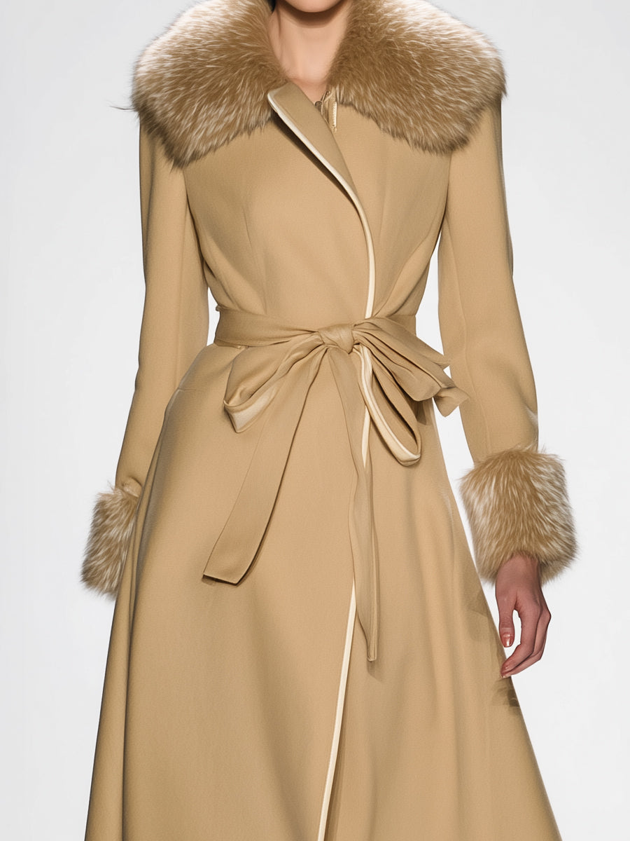Women's Camel-colored Fur-trimmed Small Lapel Wrap-Style Wool Coat