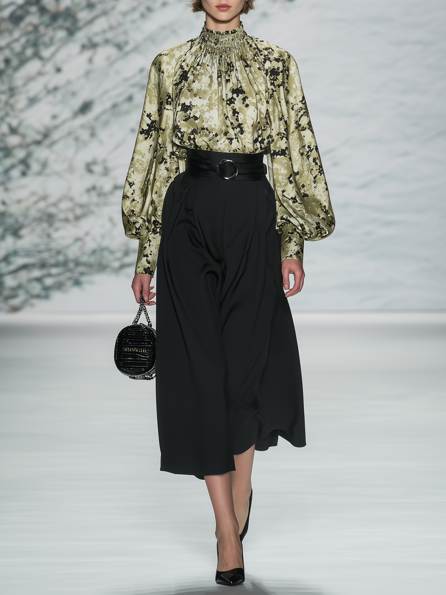Women's Elegant High-neck Lantern Sleeve Top And High-waisted Black Midi Skirt Set
