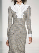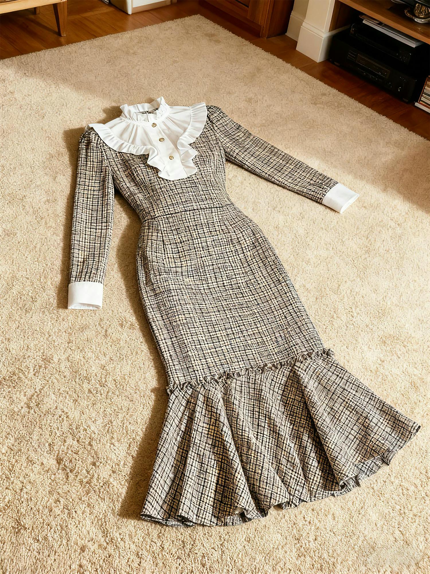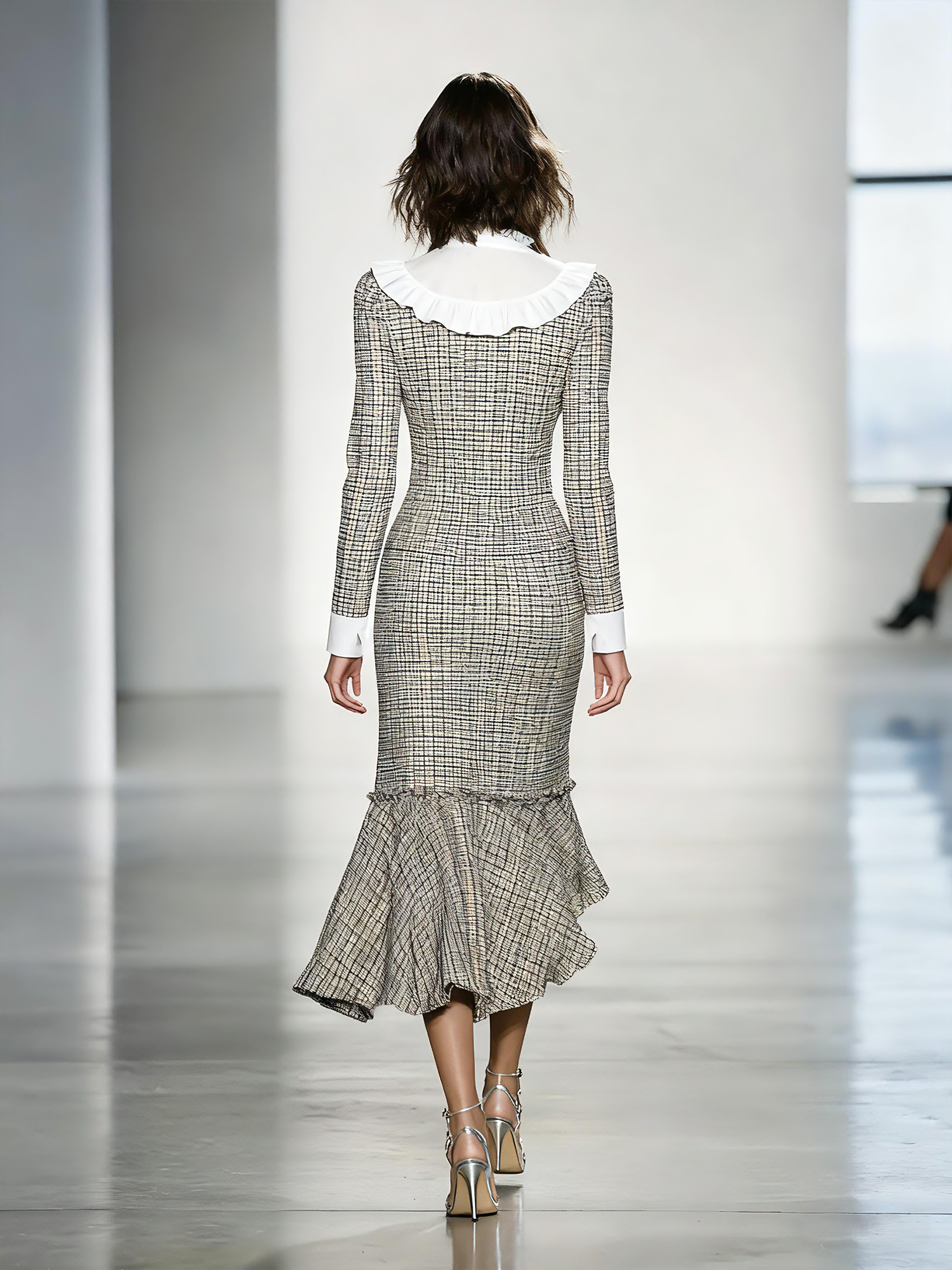 Ladies Fashionable And Elegant Shirt Collar Fake Two Piece Light Gray Plaid Fishtail Dress
