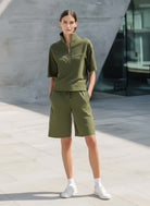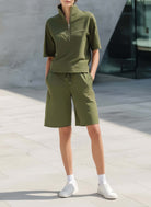 This coordinated casual suit features a short-sleeved top and matching shorts in a versatile olive green. The set presents a clean, minimalist silhouette designed for everyday wear — relaxed and easy to move in while keeping a refined, modern look. The neutral olive tone offers understated style that transitions easily from daytime errands to relaxed social outings.