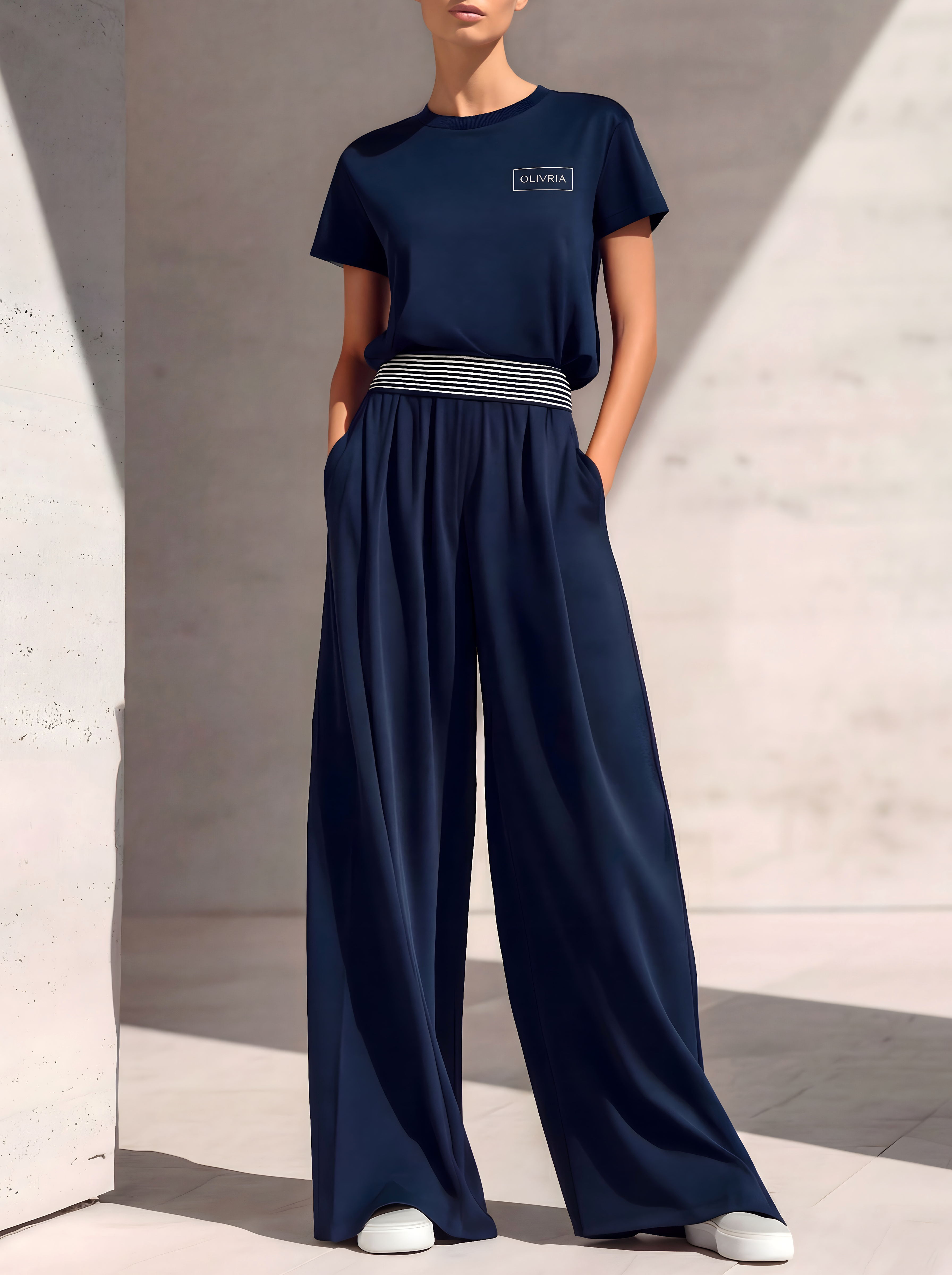 This two-piece summer set pairs a printed short-sleeved top with striped high-waisted knitted wide-leg pants in a versatile navy-blue palette. The top features a relaxed cut and a subtle print for a casual yet polished look. The pants are crafted from a soft, breathable knit with a high-rise elastic waist and a flowing wide-leg silhouette that flatters the waist and creates comfortable movement—perfect for warm-weather days.
