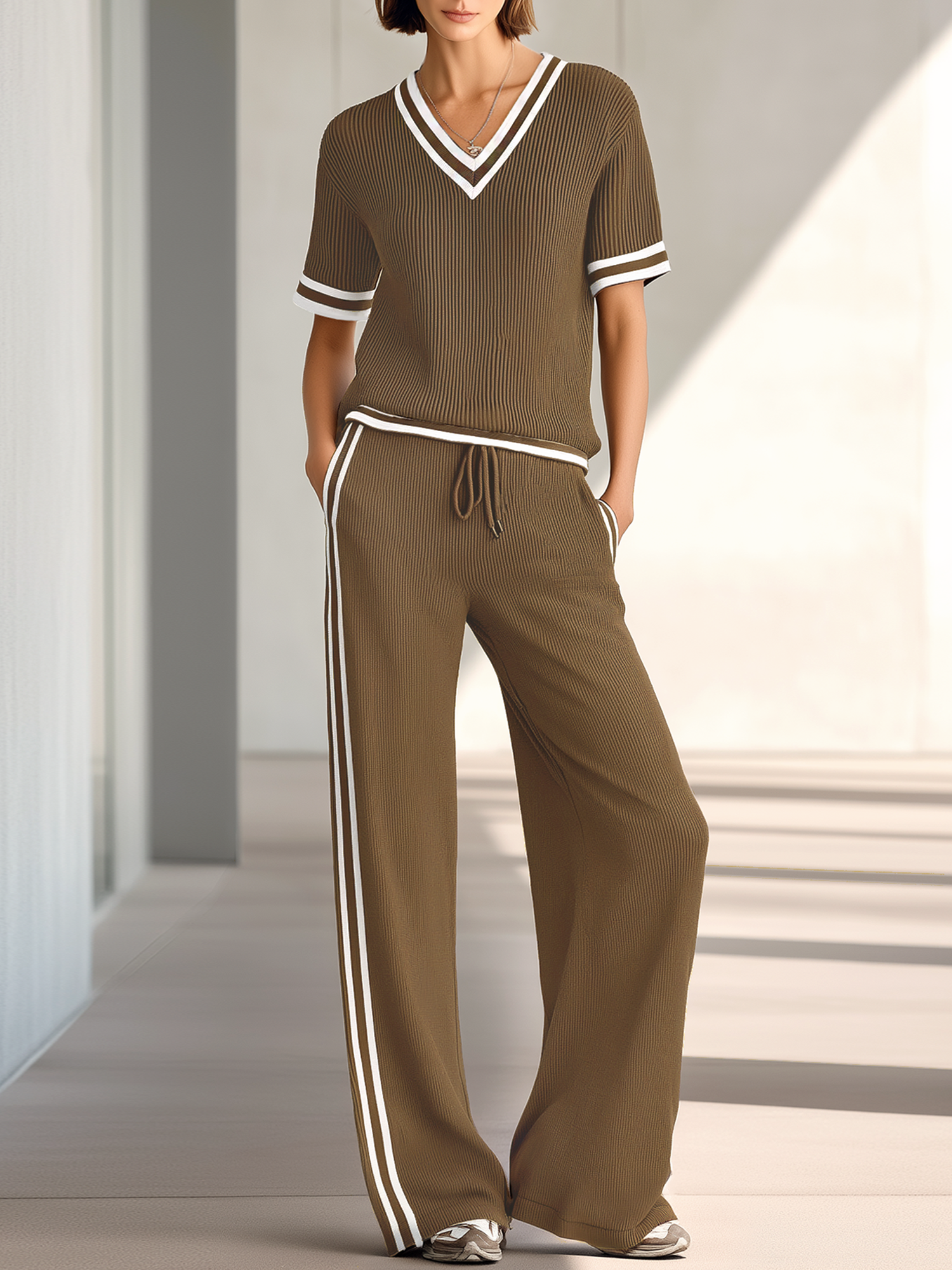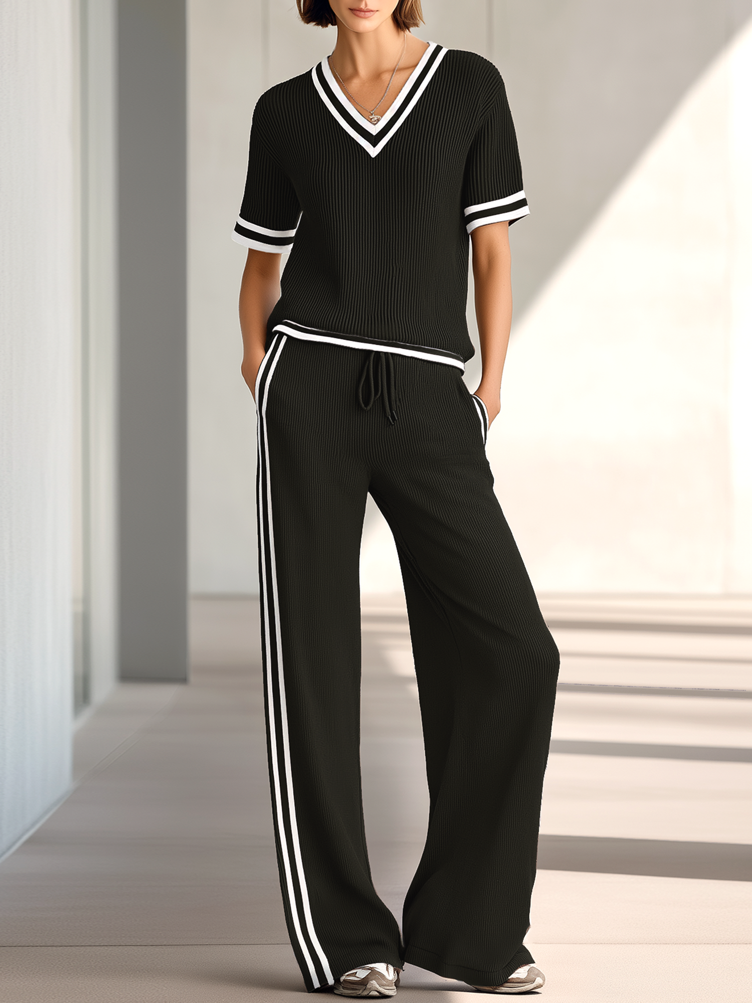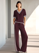 This coordinated two-piece features a relaxed V-neck short-sleeved knit top paired with matching wide-leg pants. The set is crafted from a lightweight, soft knit with a clean, minimal silhouette that drapes easily for an effortless, put-together look. Designed for everyday comfort, it blends casual ease with modern tailoring for a versatile wardrobe staple.
