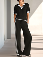 Versatile Casual V-neck Short-sleeved Knit Top And Wide-leg Pants Set