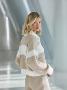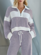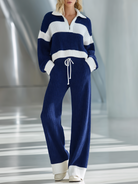 Women's Beige And White Striped Knitted Collared Half-zip Casual Set