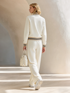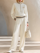 The Women's Off-White and Coffee-Colored Embroidered Two-Piece Set is a sophisticated blend of modern style and comfort. This ensemble features a half-zip stand-collar sweatshirt paired with matching wide-leg pants. Designed in an American preppy style, it embodies light luxury for a chic yet relaxed look.