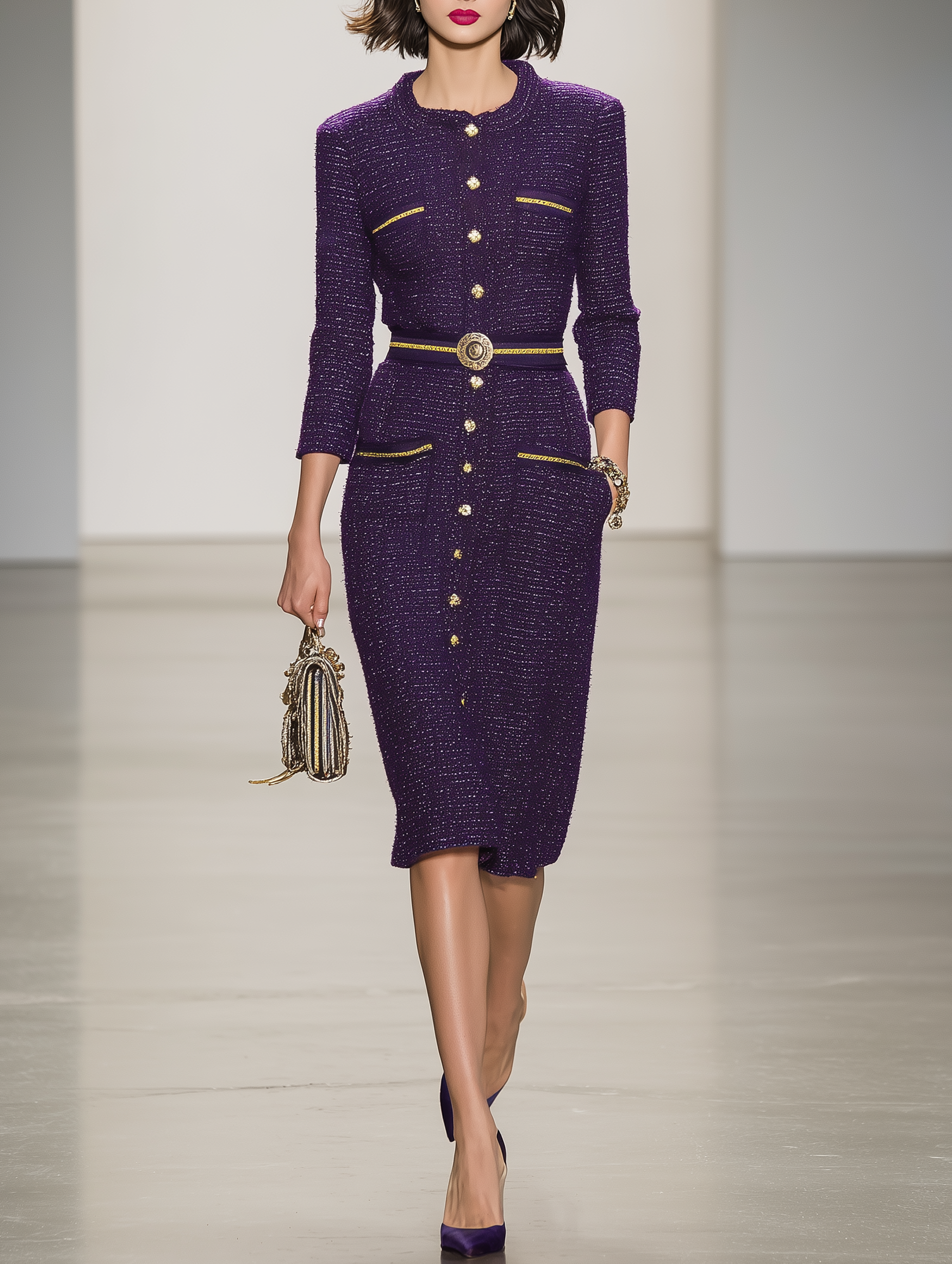 This elegant and sophisticated purple tweed dress is designed for the modern woman who values both style and functionality. The dress features a fitted waist, providing a flattering silhouette that accentuates the natural curves. The midi skirt length adds a touch of class, making it suitable for a variety of occasions, whether it's an evening event, professional office setting, or a day of commuting.