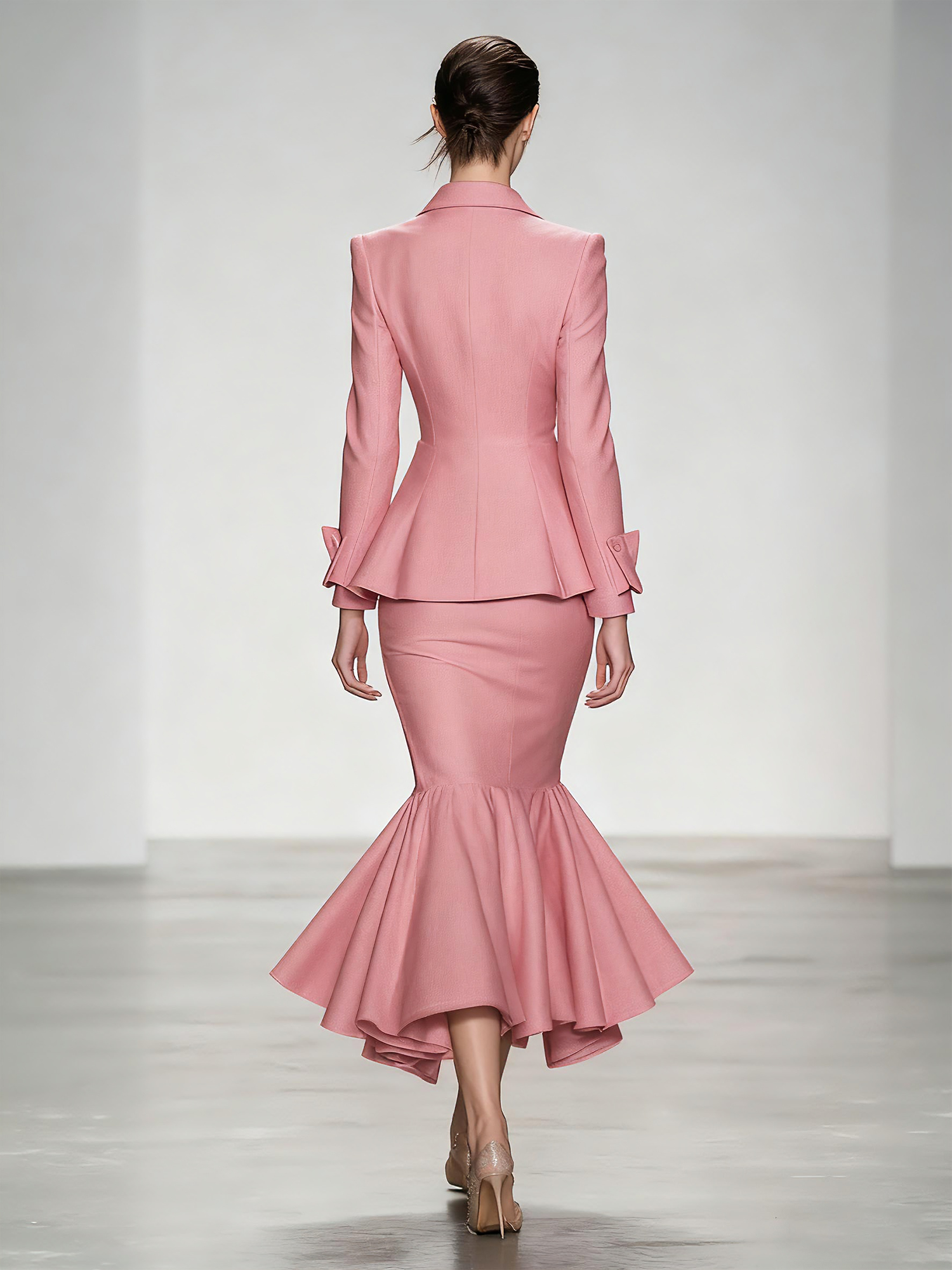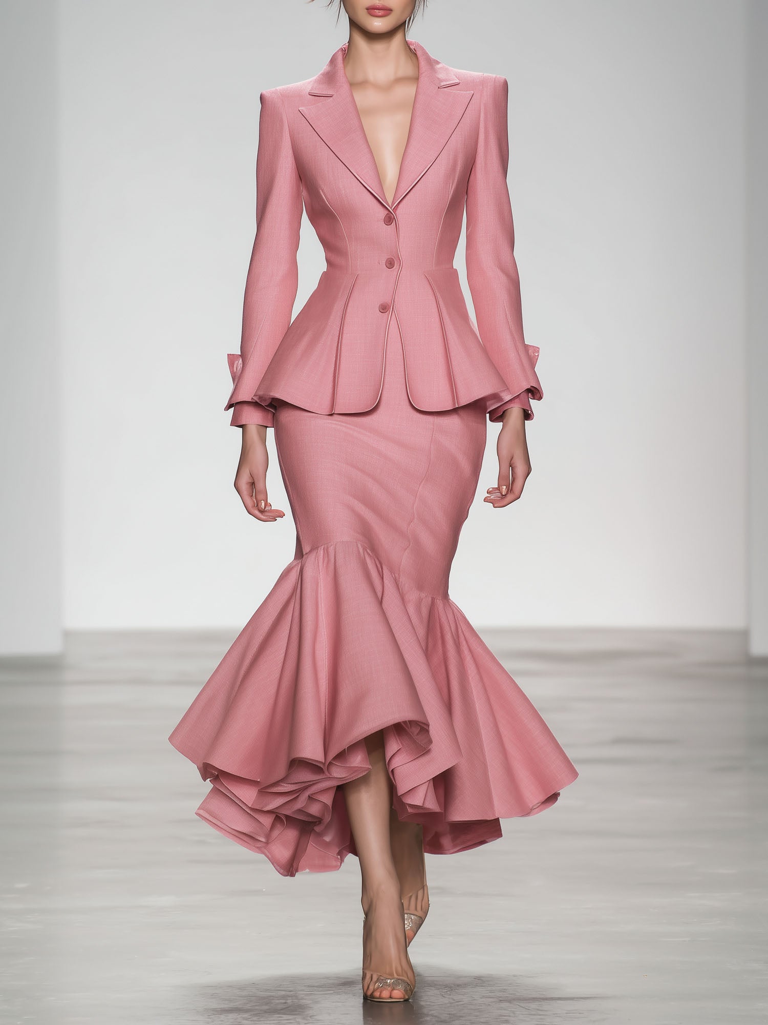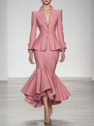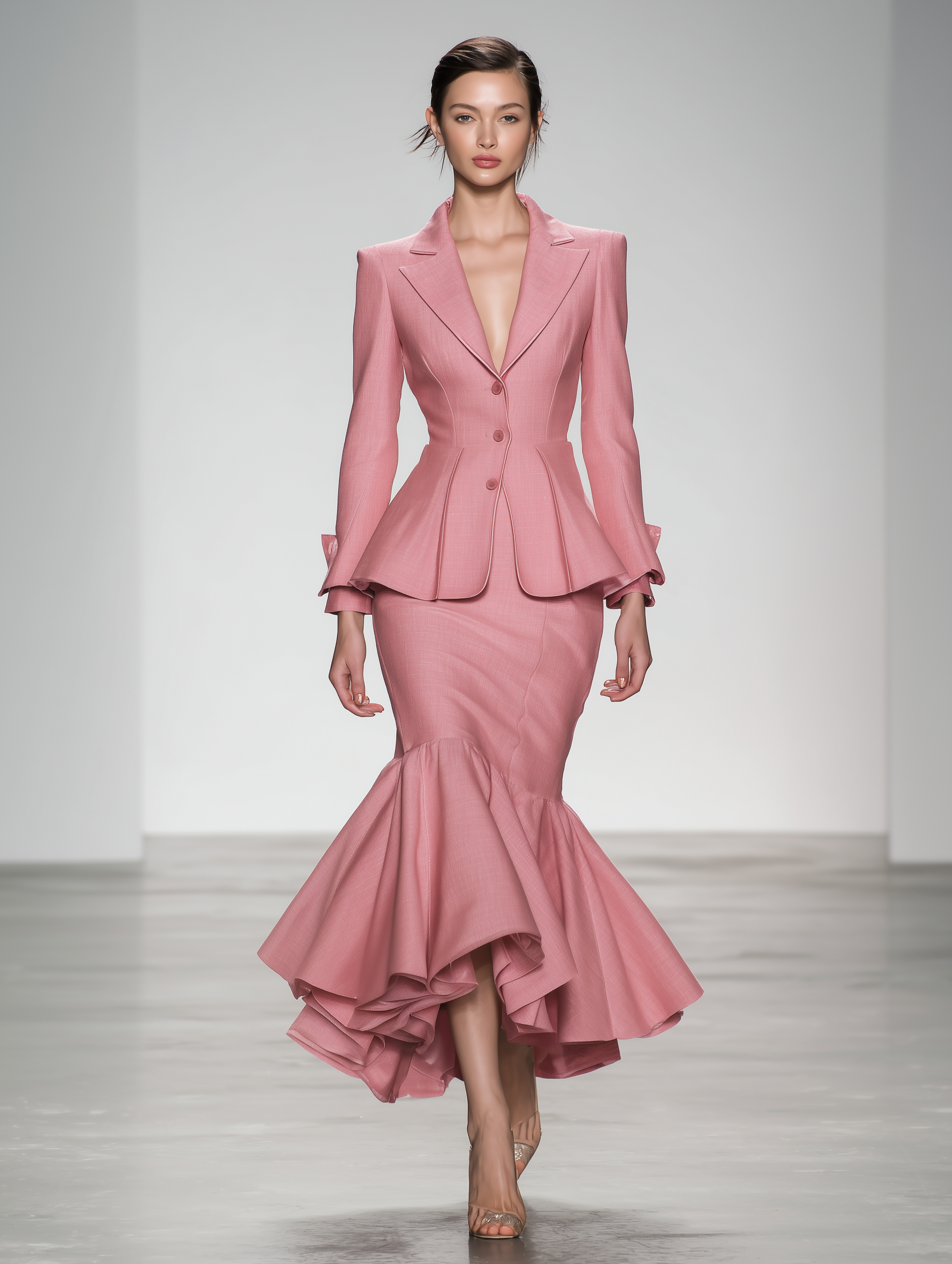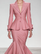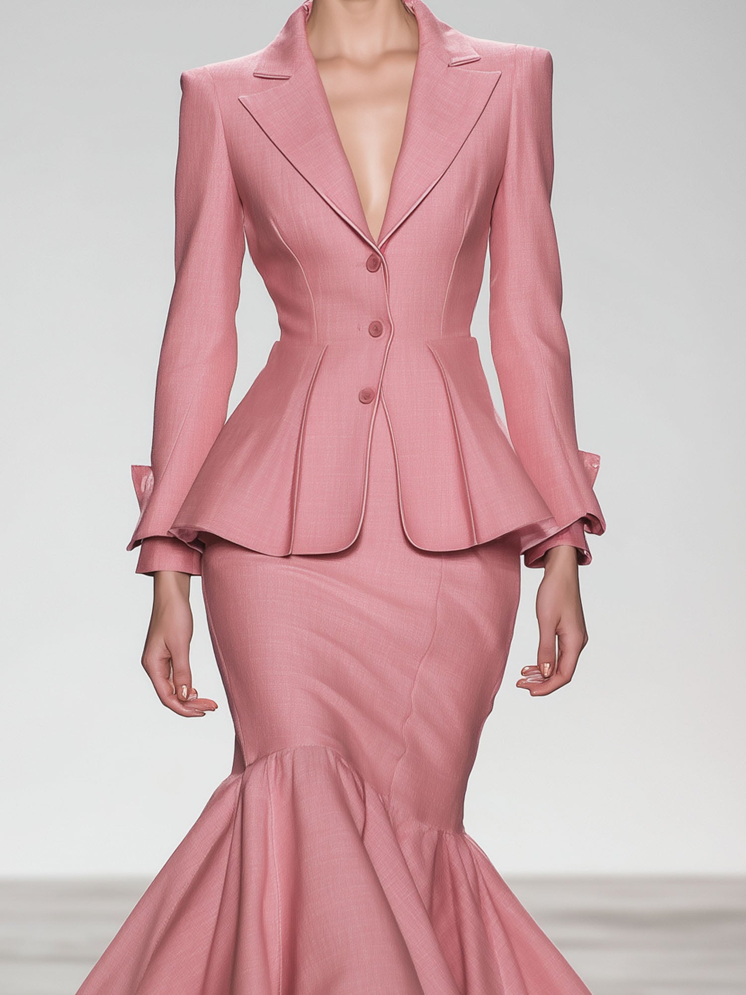 The Women's Fashionable And Elegant Pink Fitted Waist Fishtail Suit is the epitome of grace and sophistication. This glamorous ensemble is designed to make a statement at any formal gathering or special occasion.