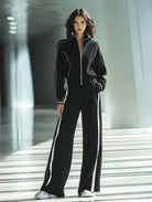 Women's Fashionable Casual Style Black Top And Trousers Set With White Piping