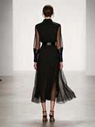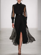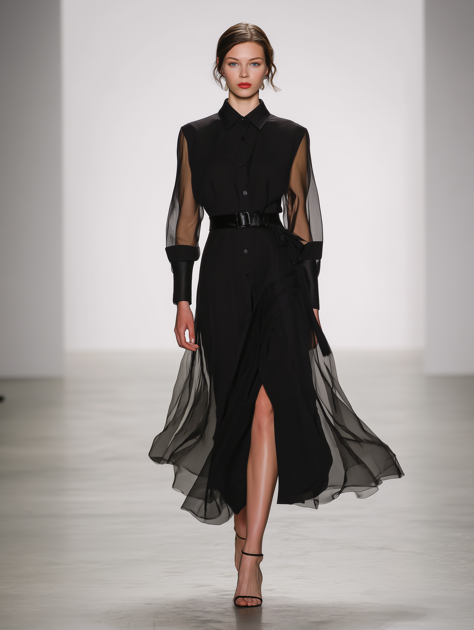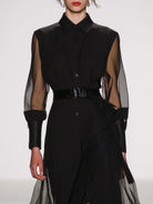 This Women's Fashionable Spliced Organza Sleeve Shirt Black Dress blends classic elegance with modern flair, creating a versatile wardrobe staple. The dress features a sophisticated design with sheer organza sleeves that add a subtle touch of femininity and elegance, making it suitable for various occasions.