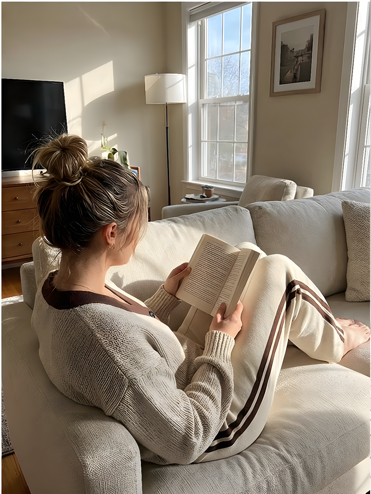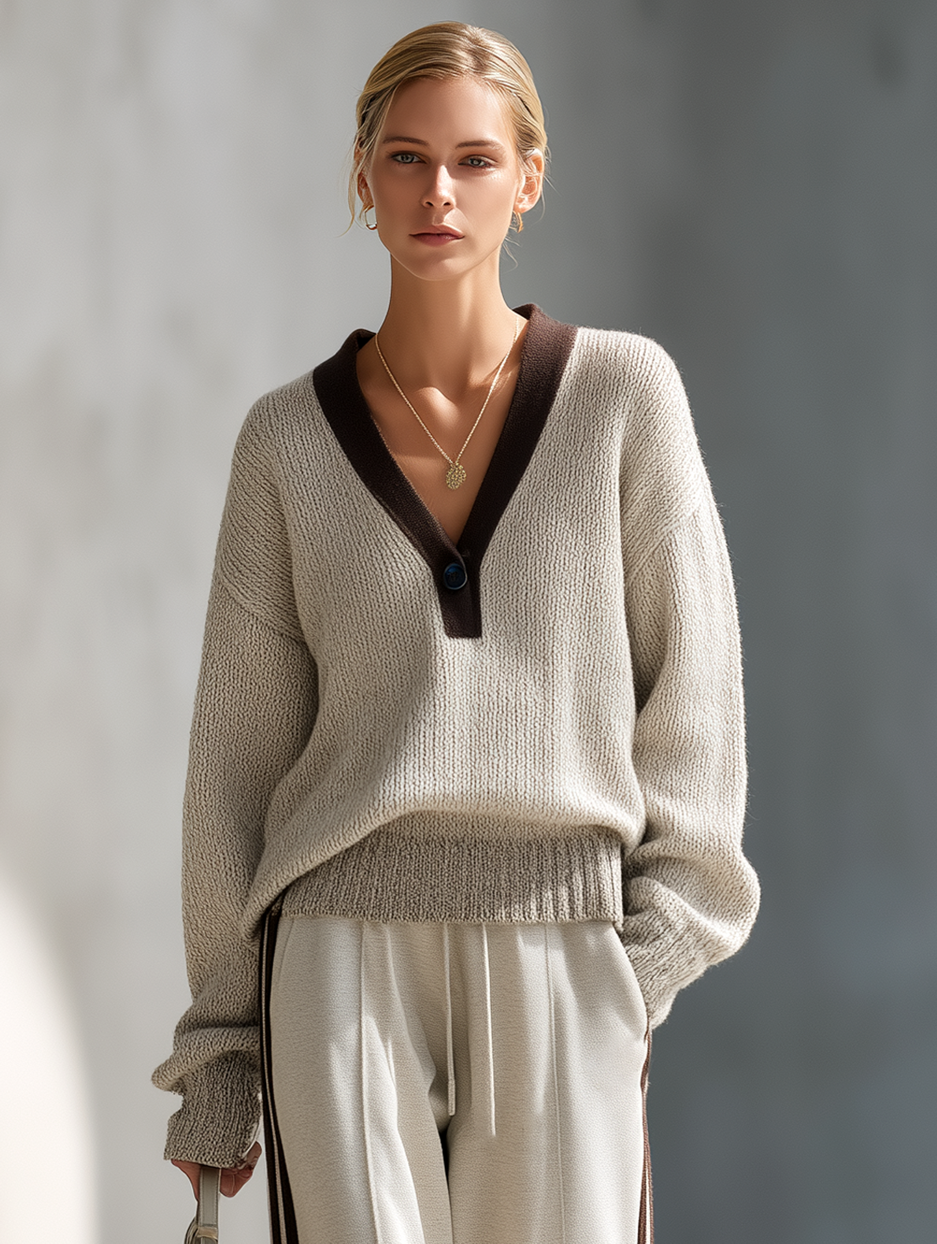 - V-neck Sweater: The half-buttoned design enhances the relaxed feel while allowing for easy layering.