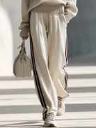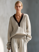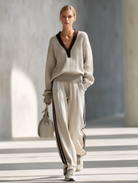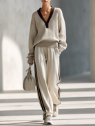 This Women's Relaxed Style Beige and Brown Color-block V-neck Knit Set offers a perfect balance of sophistication and casual comfort. The two-piece set includes a half-buttoned, loose-fitting wool sweater paired with striped wide-leg pants, making it ideal for a chic commuting outfit.