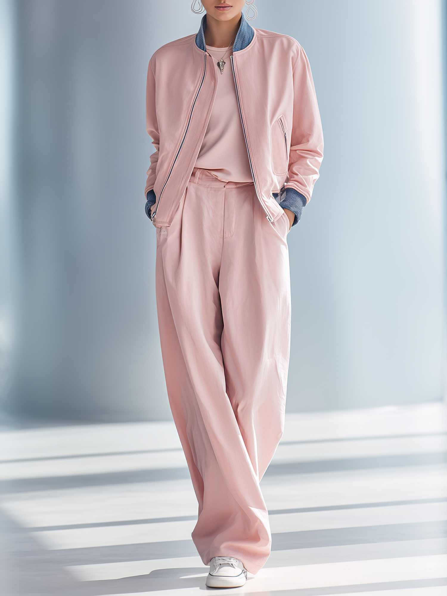 This Women's Pink Patchwork Denim Jacket and Wide-leg Pants Casual Set combines contemporary fashion with casual comfort. Its unique design and vibrant color make it a go-to choice for those looking to make a style statement while keeping things casual. A versatile and eye-catching addition to any wardrobe, it’s perfect for various occasions.