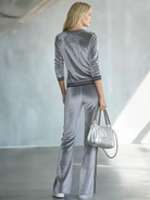 This luxurious, vintage-inspired two-piece suit is designed for women who appreciate elegance with a modern twist. The set includes a V-neck long-sleeve top and wide-leg pants, both crafted from high-quality velvet fabric in a stunning silver-gray hue embellished with subtle black stripes for added sophistication.