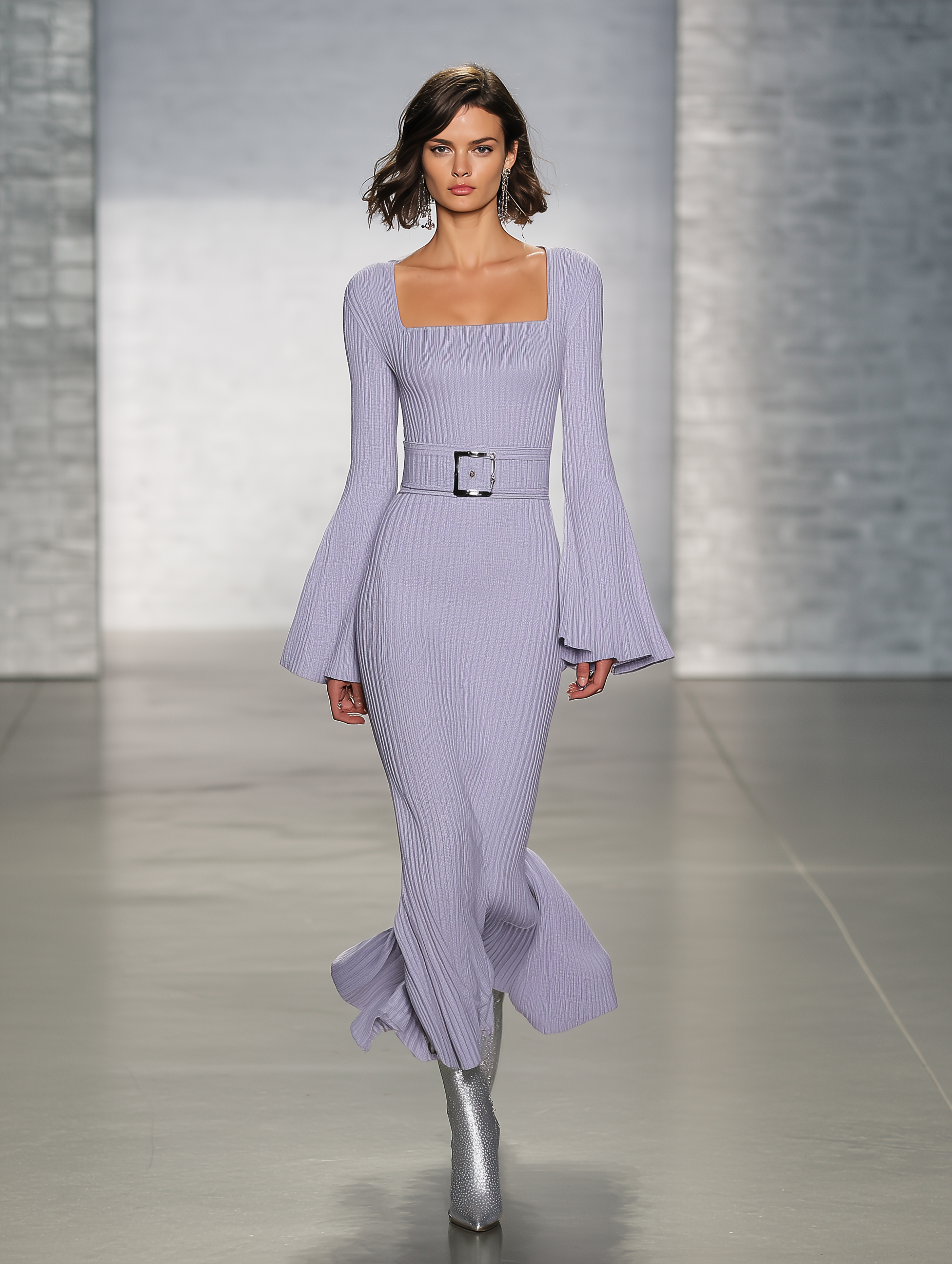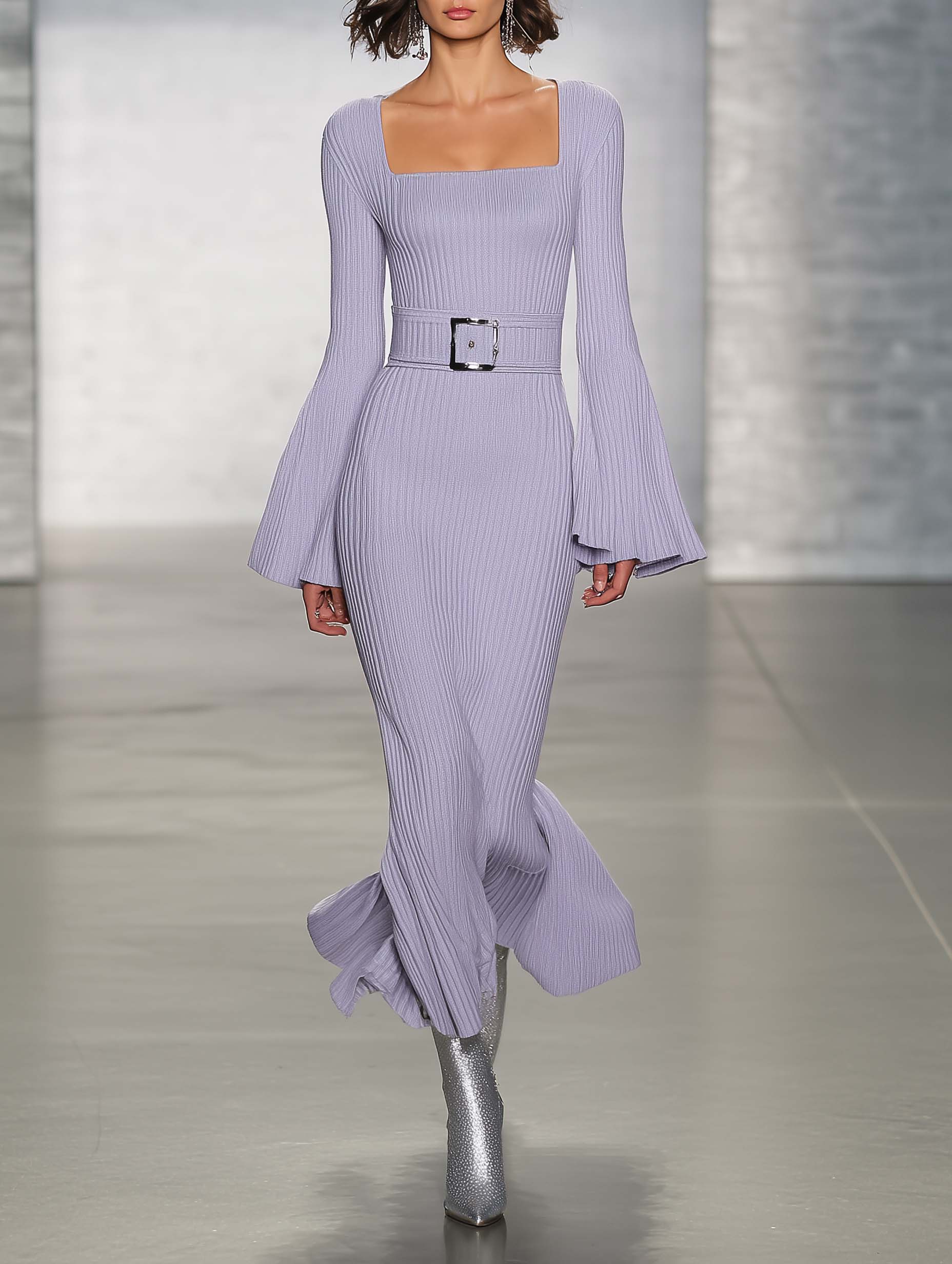 Women's Square Neck, Bell Sleeve, Light Purple Long Dress