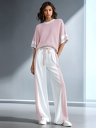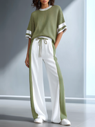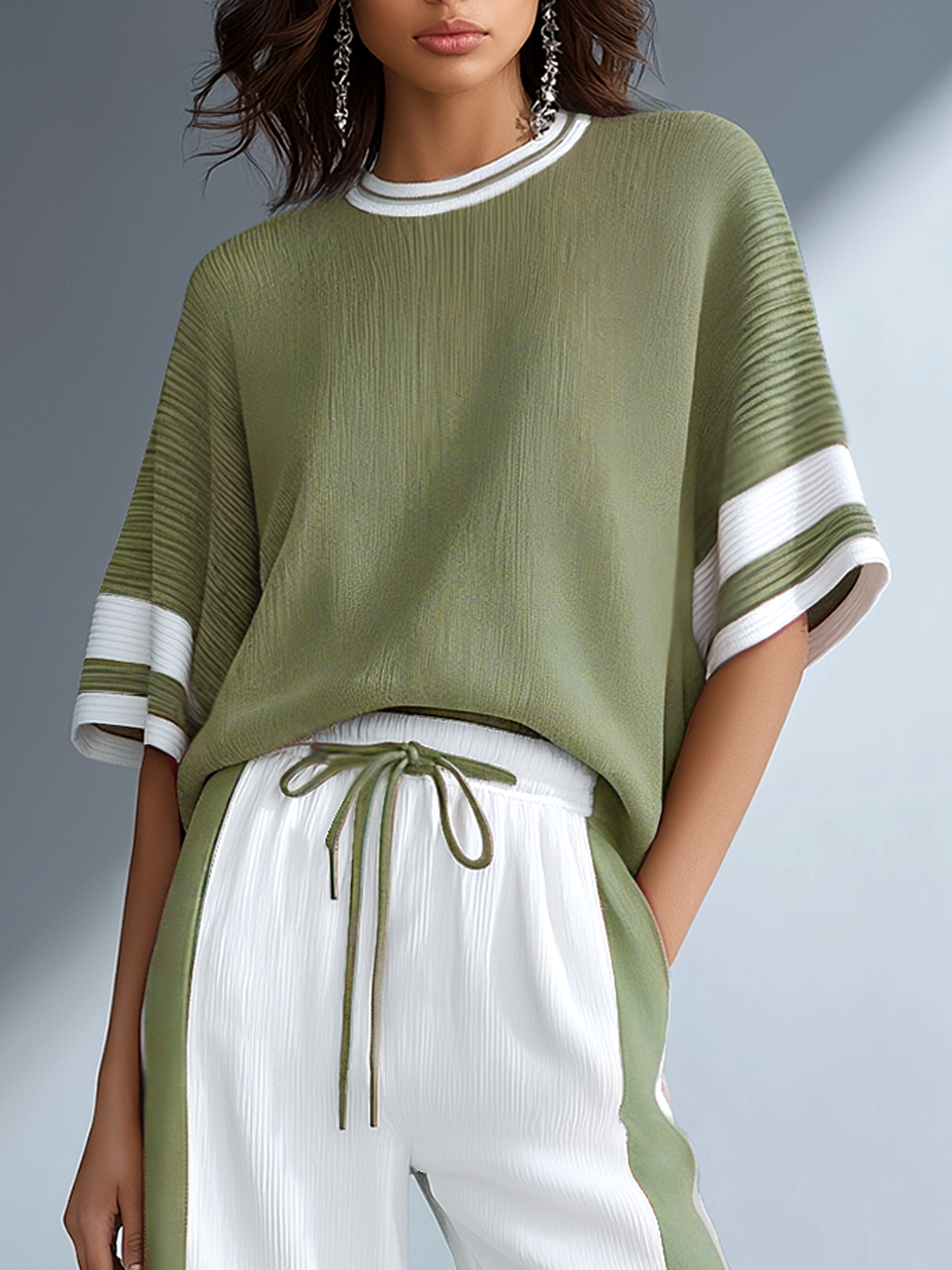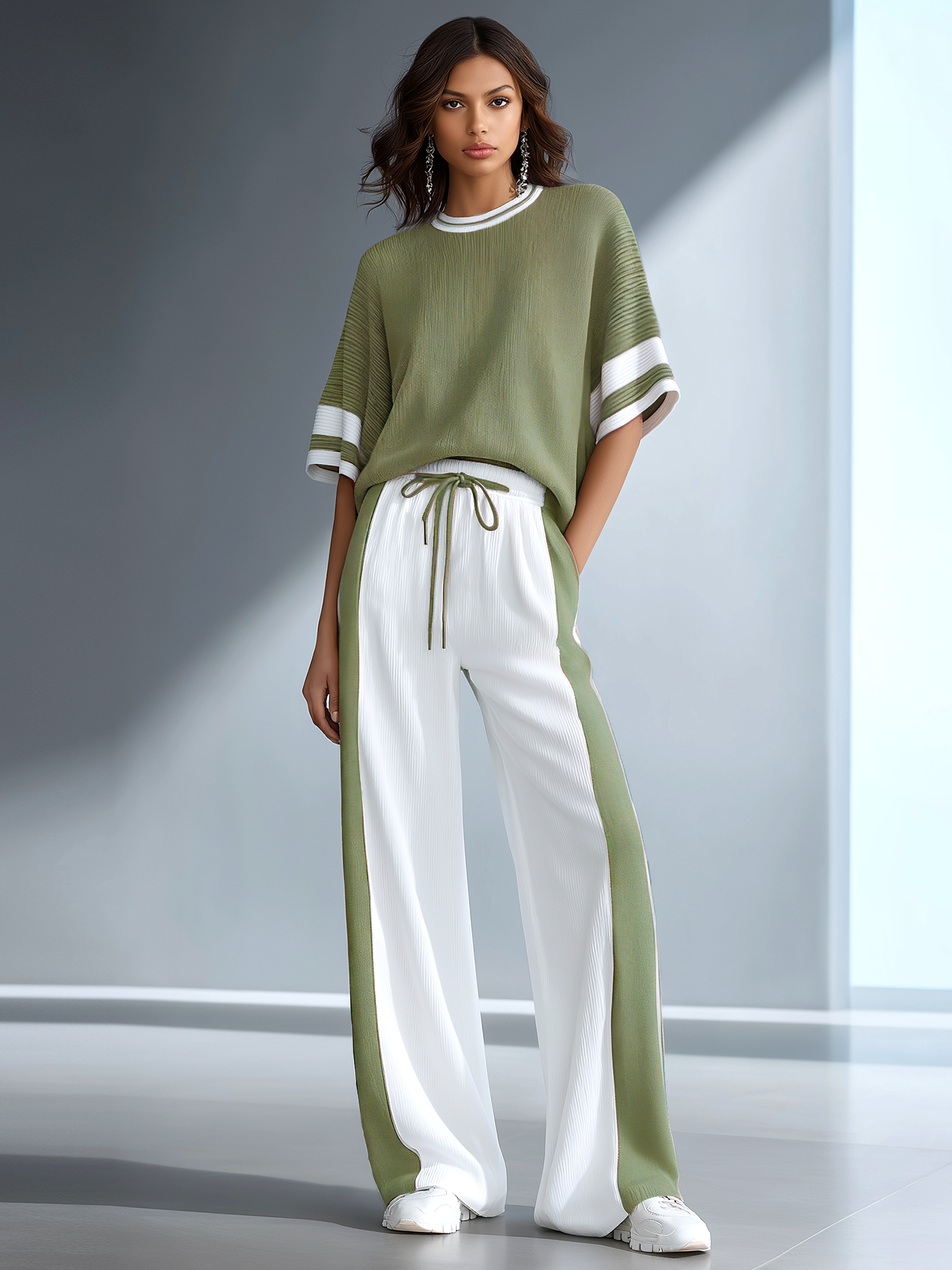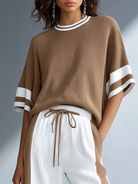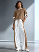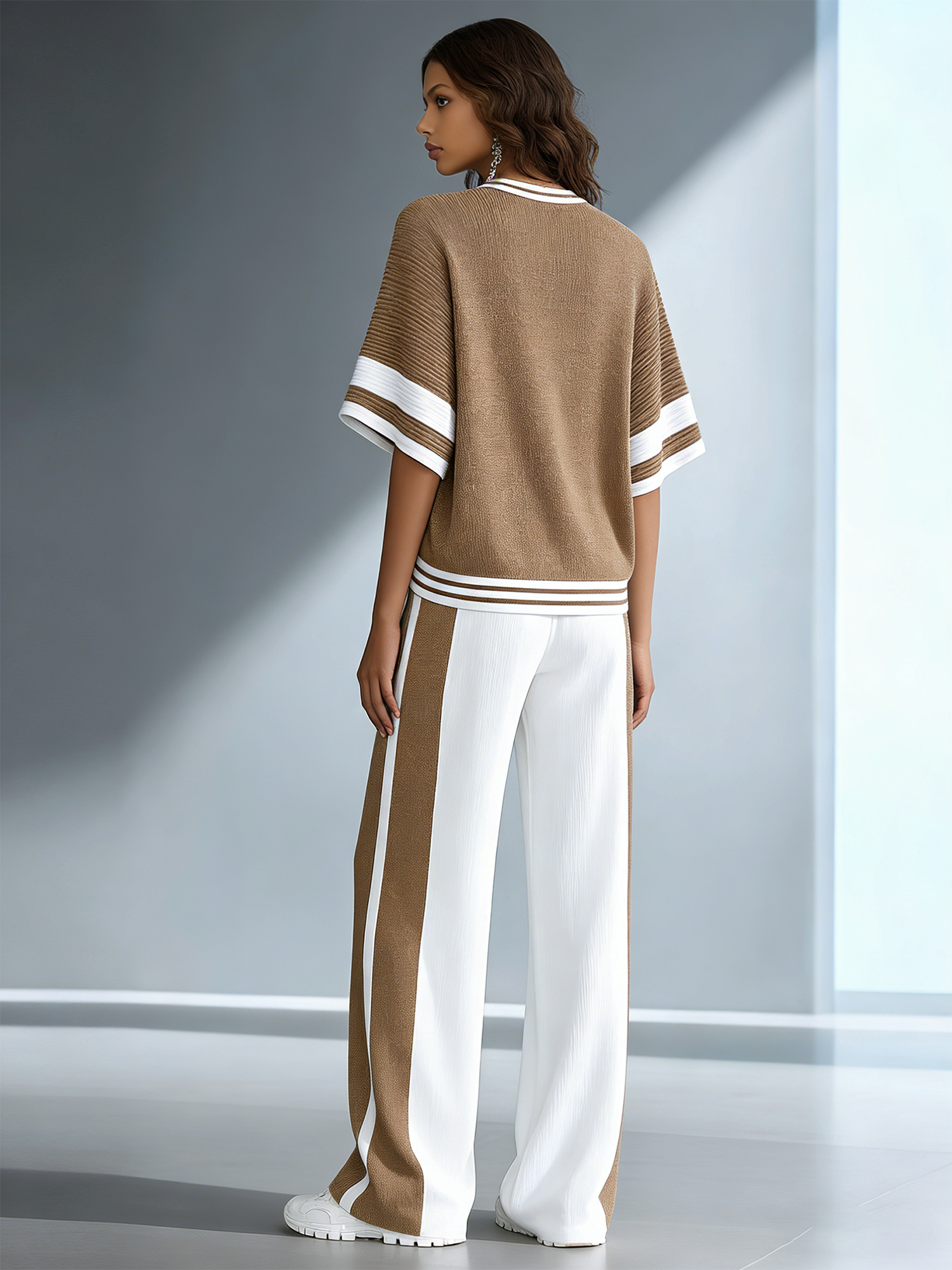 Women's Stylish Casual Brown Color-block Short-sleeved Knitted Top And Trousers Set