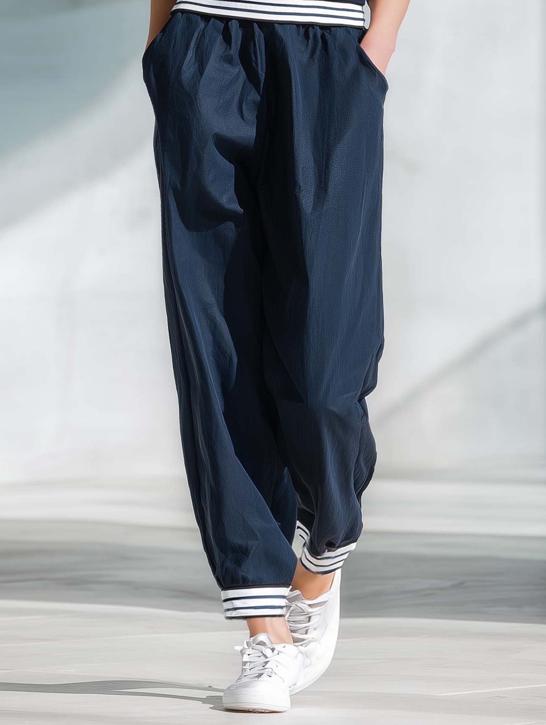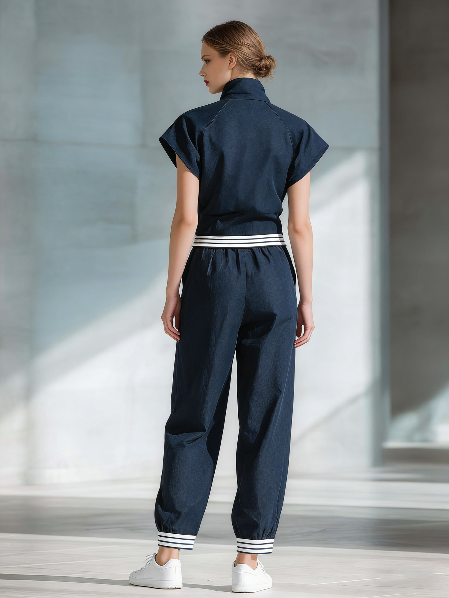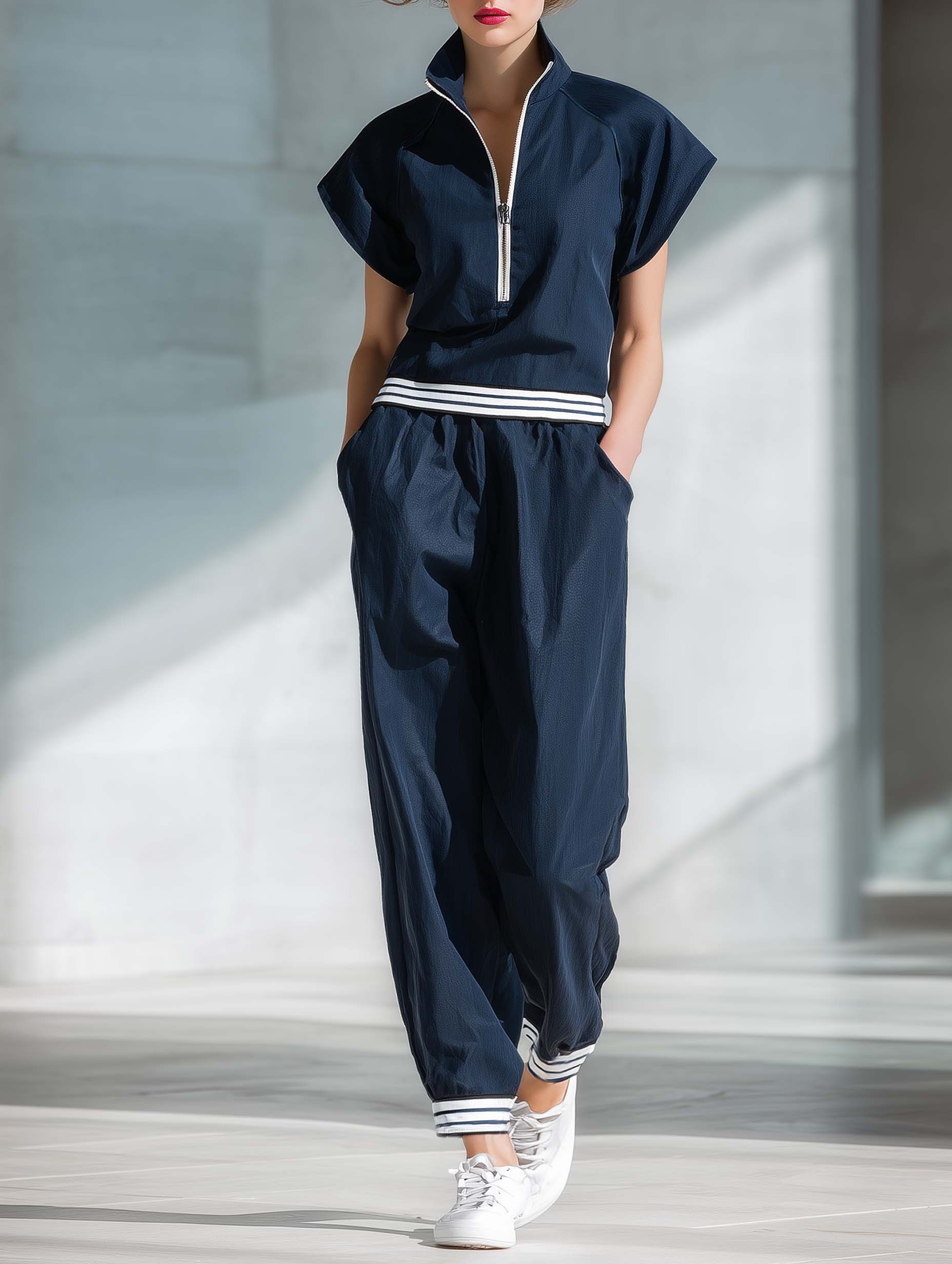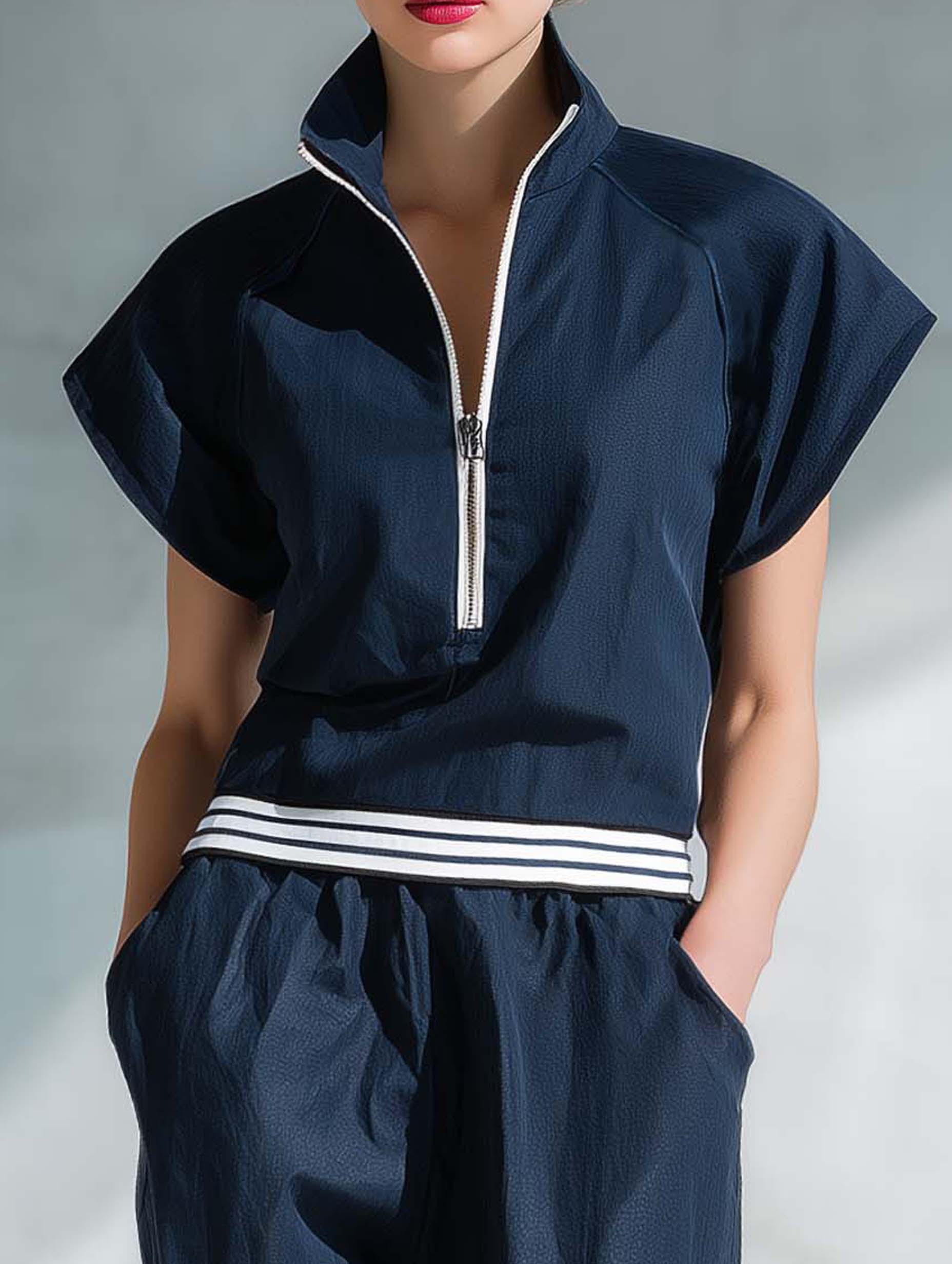 In summary, the Women's Stylish Casual Dark Blue Short-sleeved Top and Trousers Set is a superb choice for those who value both style and comfort. Its versatile design and elegant color make it a staple in any wardrobe, perfect for creating both laid-back and polished looks.