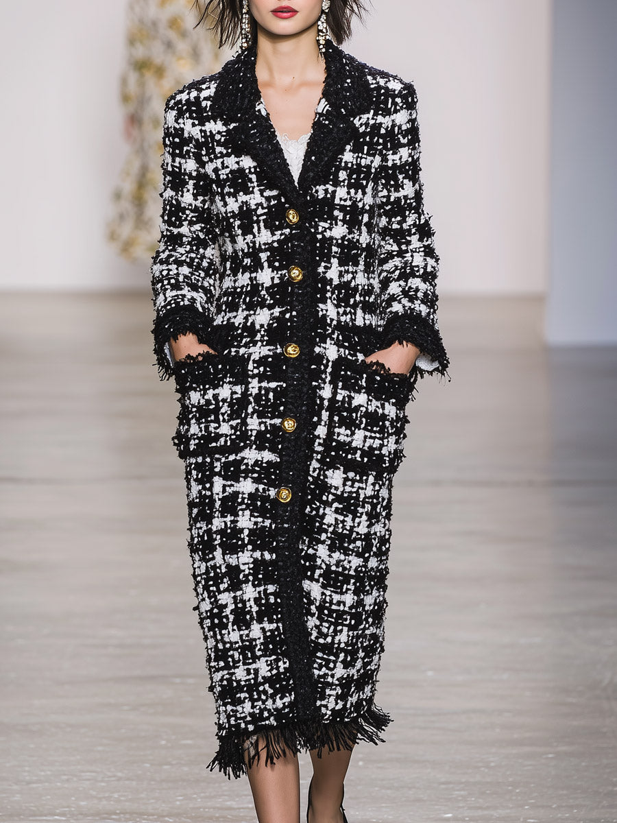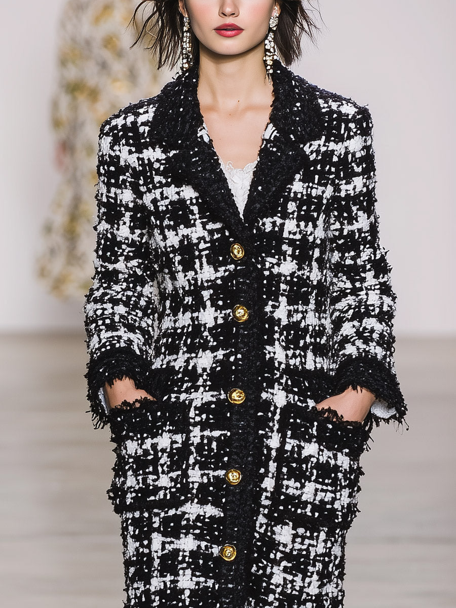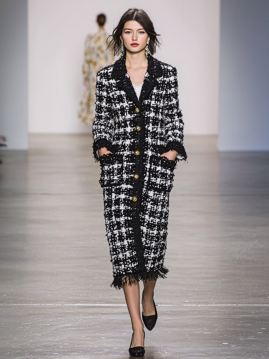 Sophistication and style meet comfort with this Chanel Style Woven Black And White Checkered Long Coat. Its timeless design and versatile nature create endless possibilities for fashion expression, making it a quintessential piece for any wardrobe.