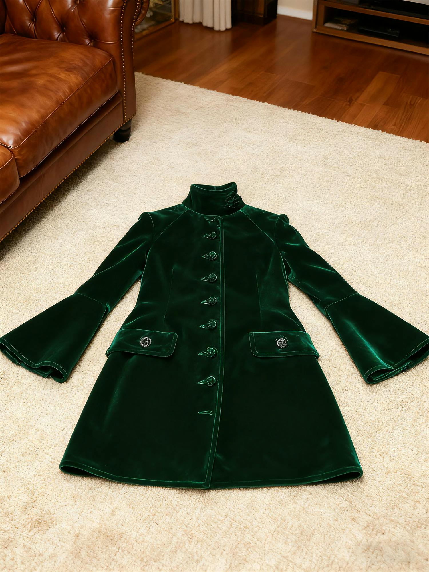 Pair this velvet jacket with a simple blouse and tailored trousers for an effortlessly elegant look perfect for both day and night. For a more edgy vibe, combine it with a leather skirt and ankle boots. Adding gold accessories would complement the dark green tone beautifully, giving off a luxurious appearance.