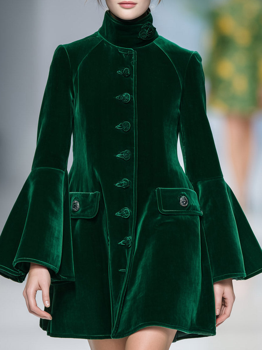 Dark Green Short Skirt Fashionable Stand Collar Velvet Jacket