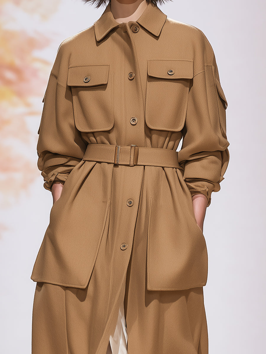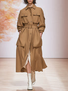 Women's Belt Waist Pocket Decoration Loose Casual Brown Windbreaker Coat