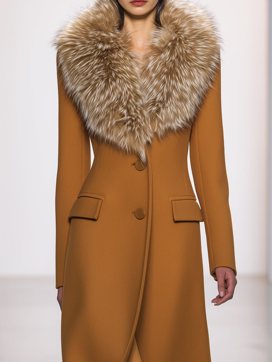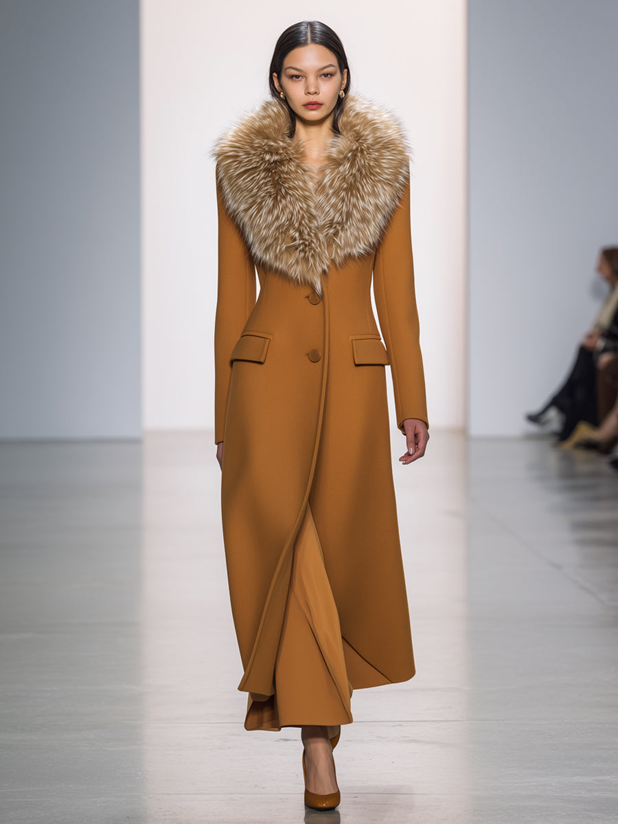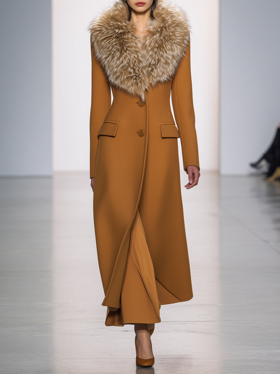 Women's Fur Collar Decorated Slim Fit Fashionable Commuting Orange Brown Long Woolen Coat