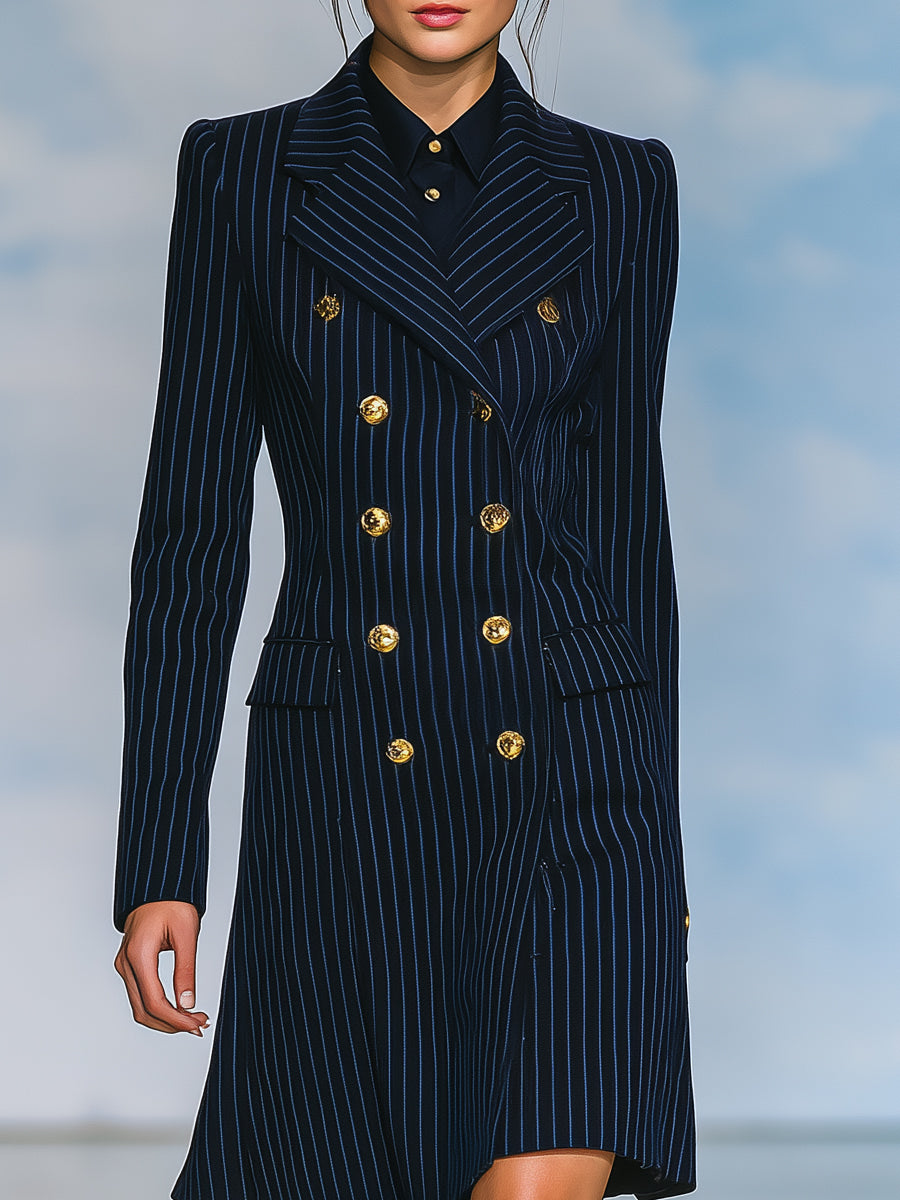 Women's Navy Blue Striped Mid-length Slim-fit Fashionable Coat
