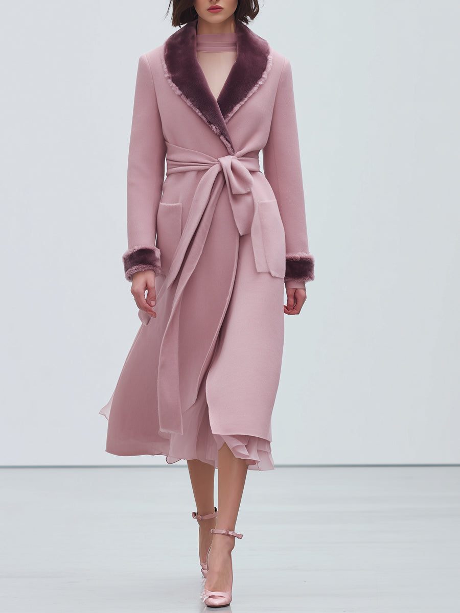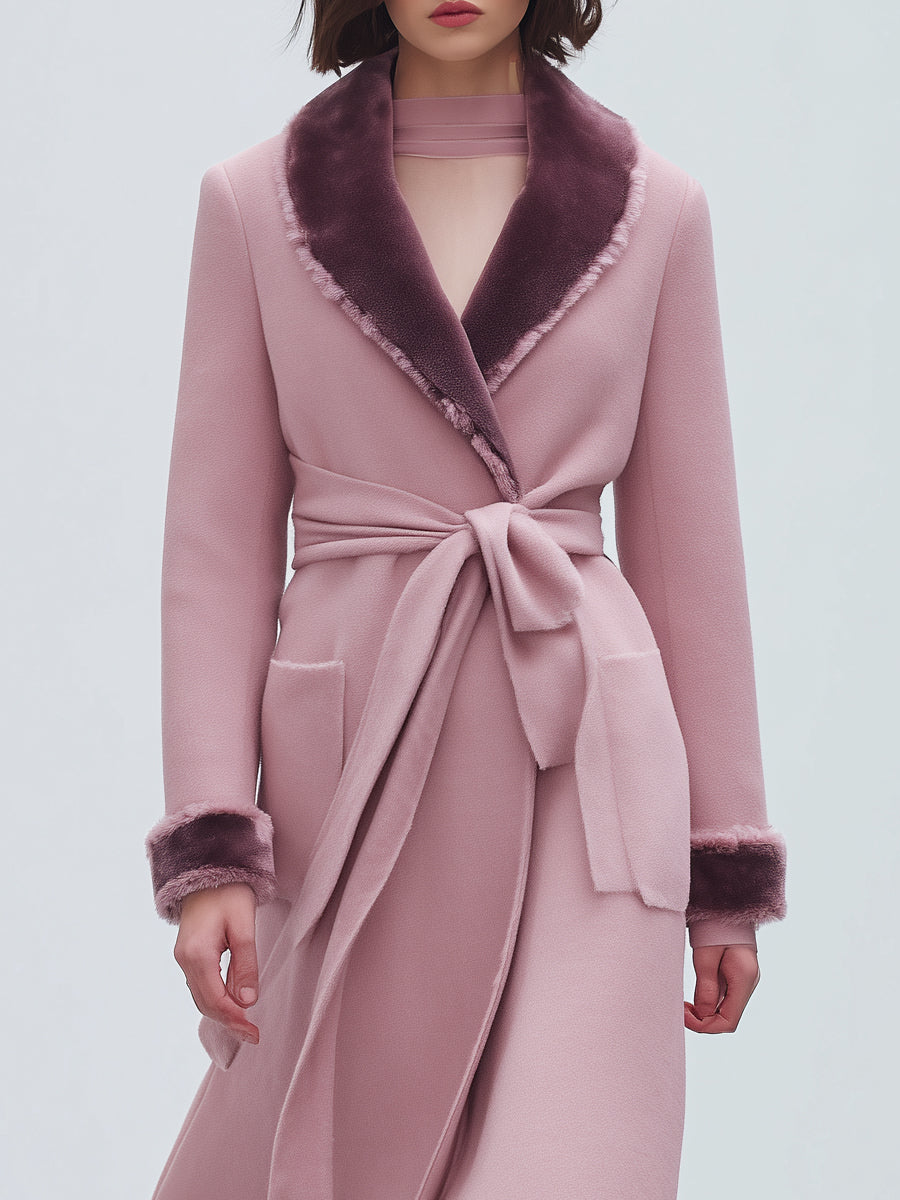 Women's Short Fur Stitching Fur Collar Berry Pink Fashion Wrap Coat