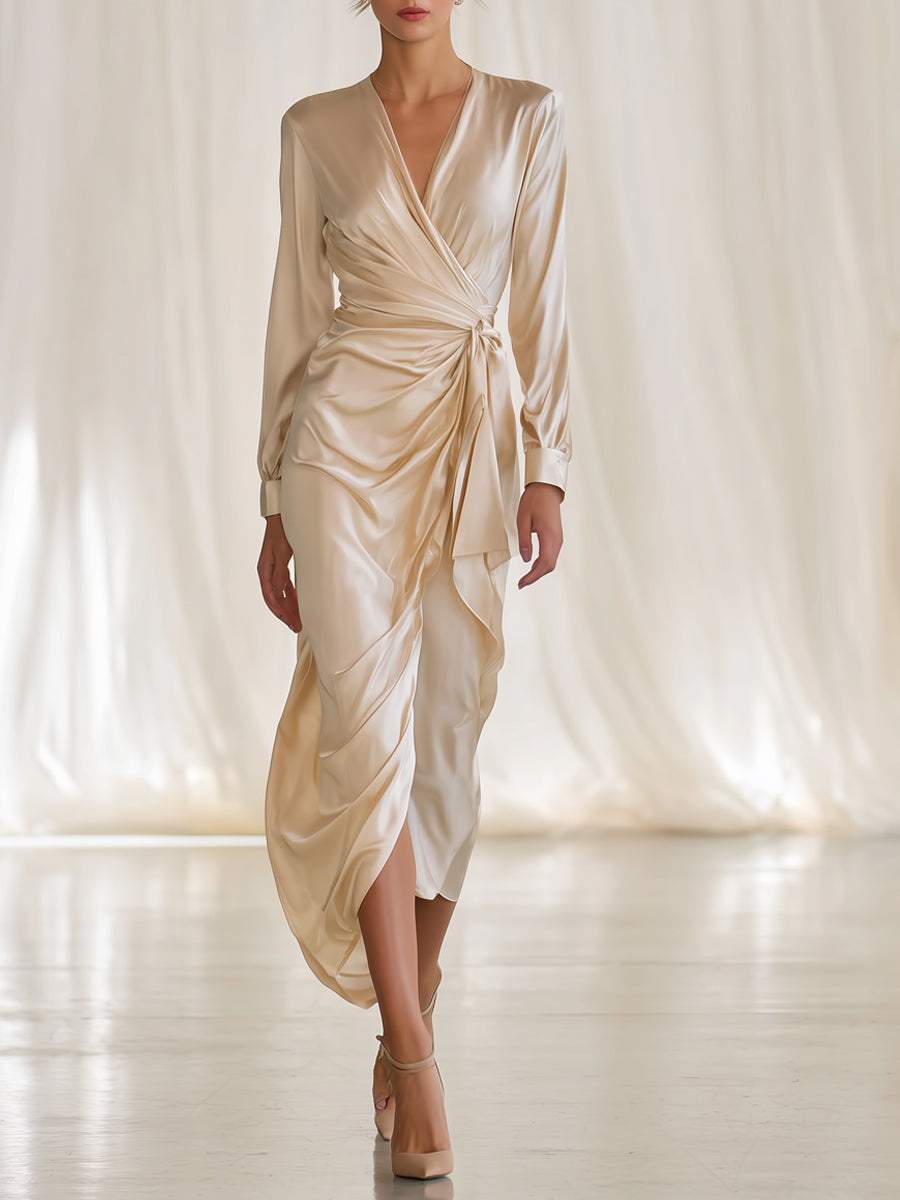 Women's Champagne Gold Waist Pleated Fashionable Simple Shirt Dress