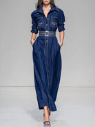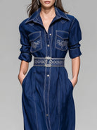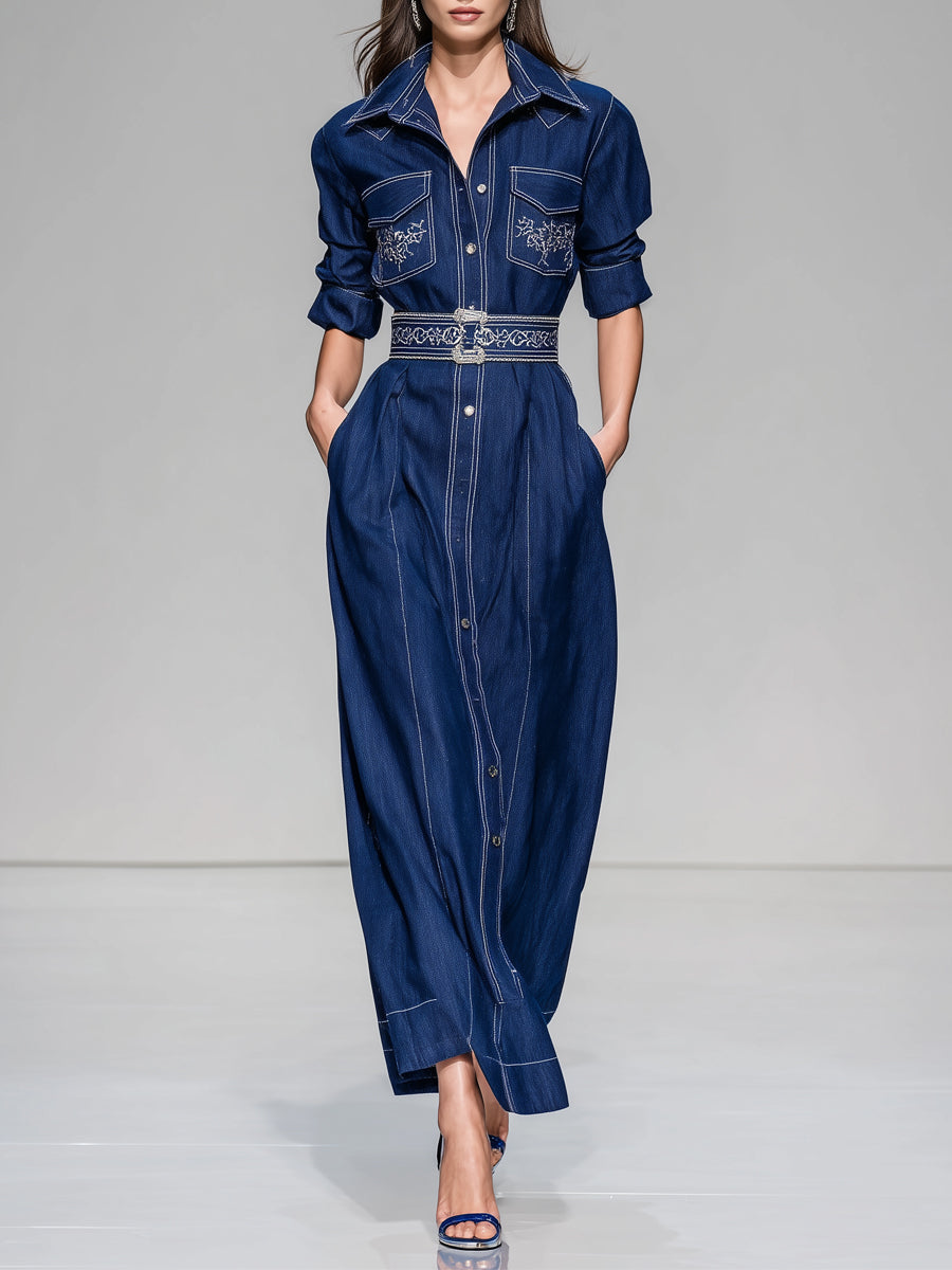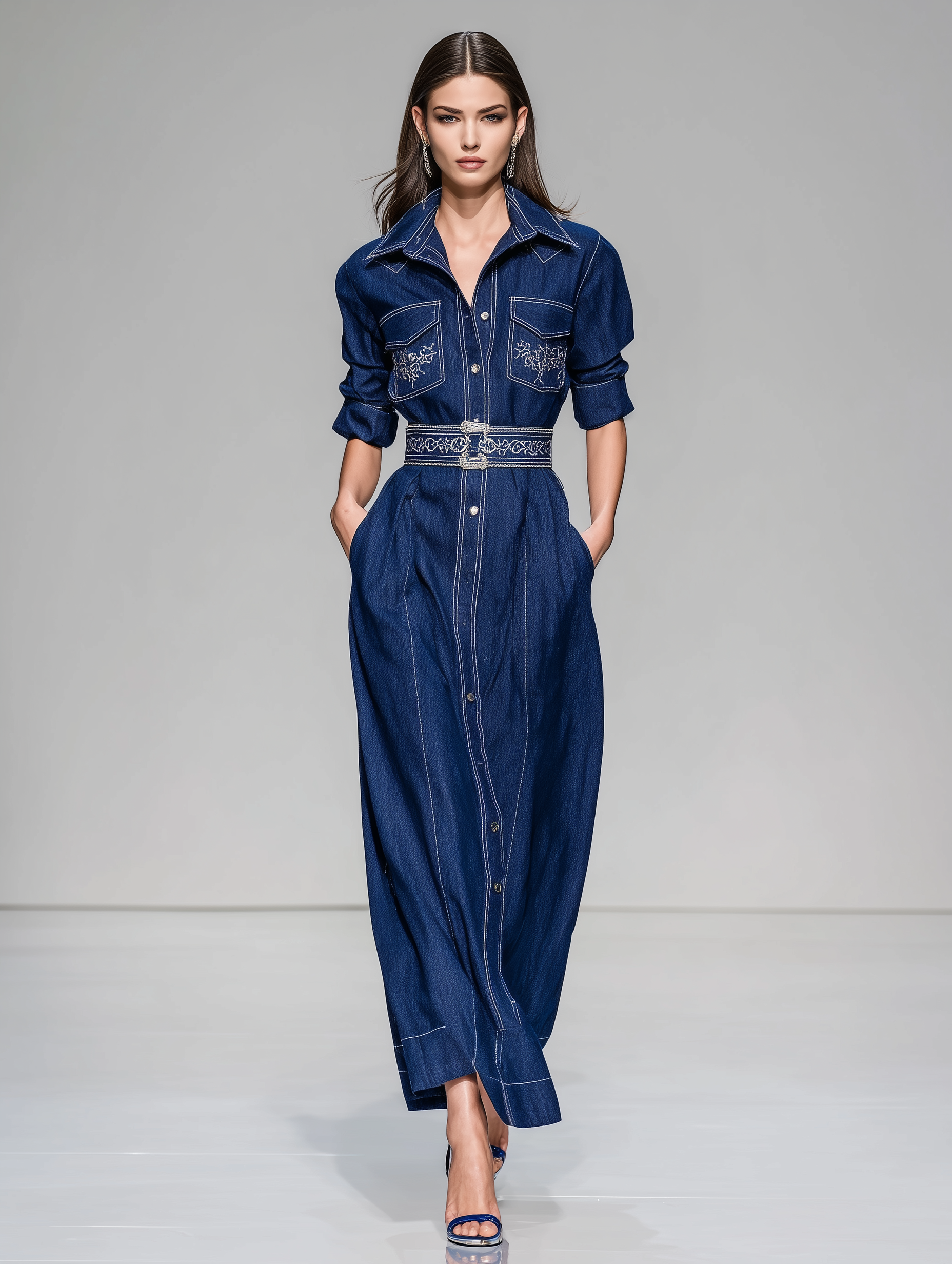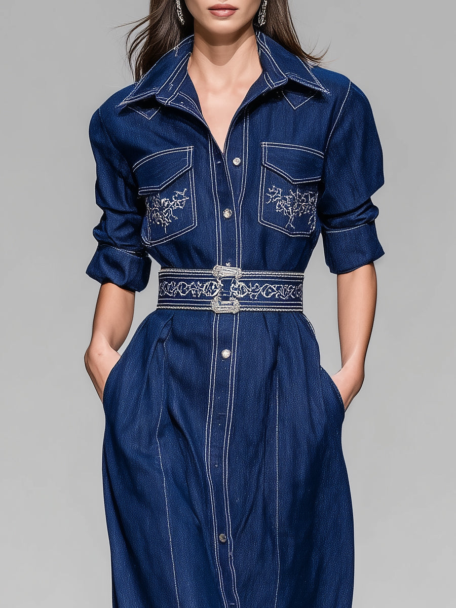 Women's Dark Blue Denim Shirt Collar Embroidered Belt Elegant Dress