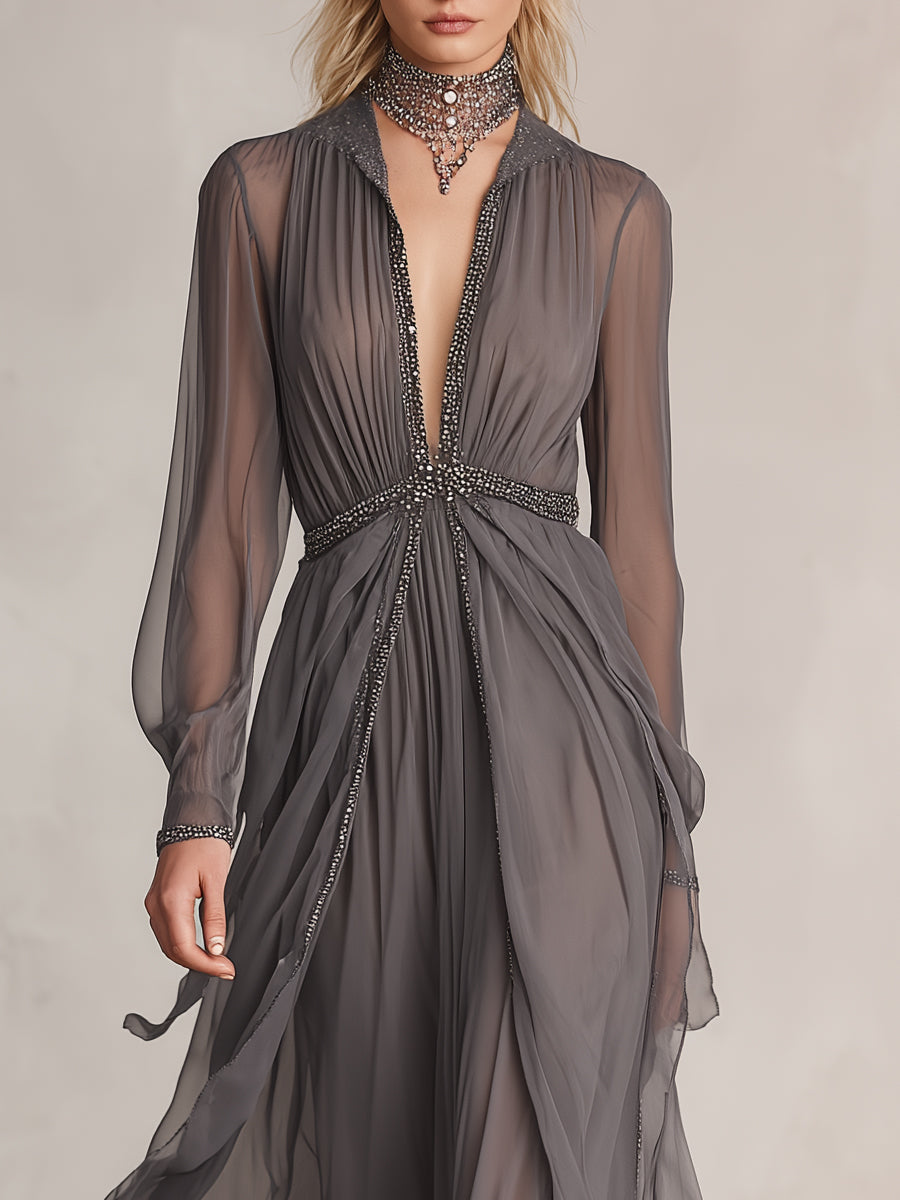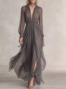 Women's Elegant Light Grey Dress With Ribbon Decoration, Deep V-neck, Waist And Slits