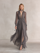 This Women's Elegant Light Grey Dress is a captivating piece designed for sophistication and style. Featuring a deep V-neck, it brings a touch of allure to your look. The dress is highlighted by a charming ribbon decoration that accentuates the waist, enhancing your silhouette beautifully. With strategically placed slits, this dress provides both comfort and an elegant flow, making it a perfect choice for various occasions.