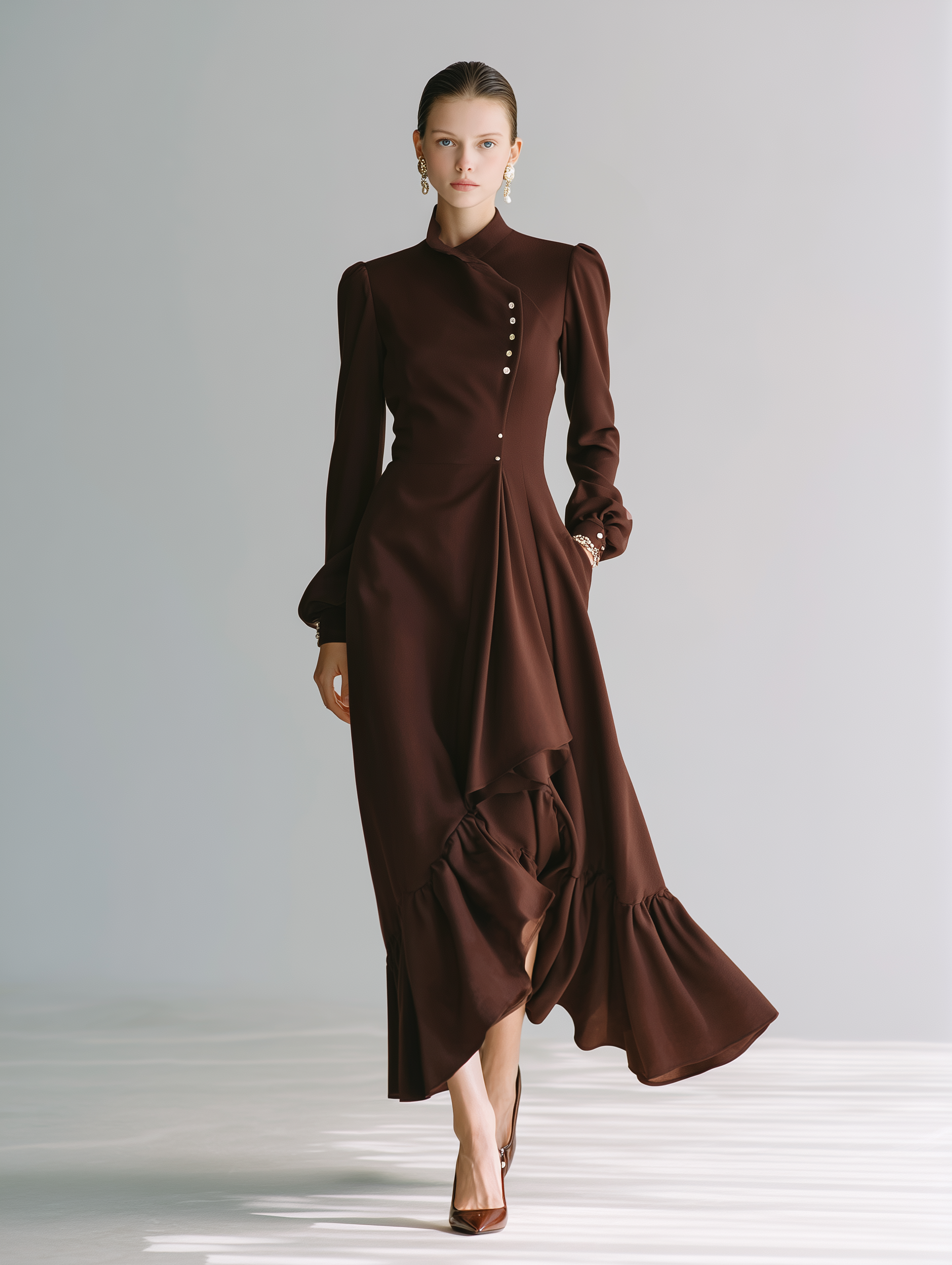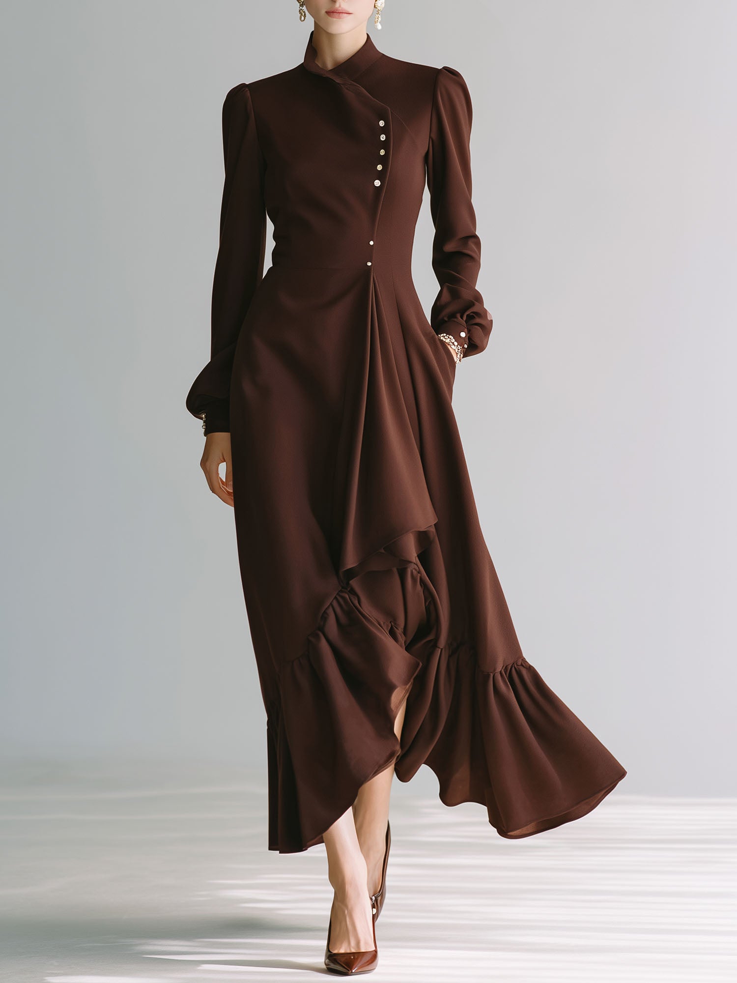 Women's Fashionable And Elegant Dark Brown Dress With Slanted Placket, Decorative Buttons, And Ruffles.