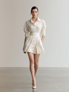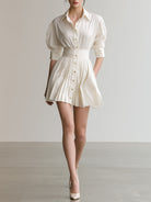 Women's Fashionable Simple Ivory Shirt Style Pleated Short Dress
