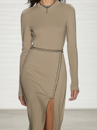 Women's Knitted Slit Decorative Ribbon Long-sleeved Long Khaki Gray Dress