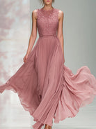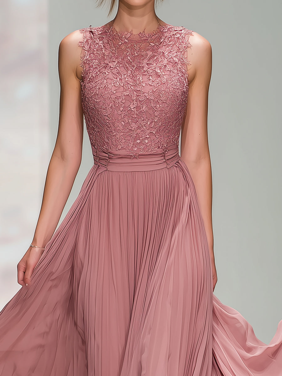 Women's Lace Splicing Sleeveless Long Pleated Gray Pink Elegant Fashion Dress