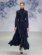 With its combination of classic design elements and chic modern details, this navy blue dress is perfect for the fashion-forward individual who appreciates timeless elegance. Whether attending a wedding, gala, or a sophisticated evening event, this dress promises to make a lasting impression.