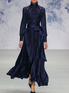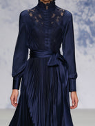 Explore elegance and sophistication with this women's navy blue dress, featuring a graceful bow-decorated belt and delicate pleated lace detailing. This dress is a timeless addition to any wardrobe, perfect for both formal and semi-formal occasions. Its classic navy blue hue exudes a sense of tranquility and confidence, making it suitable for various settings.