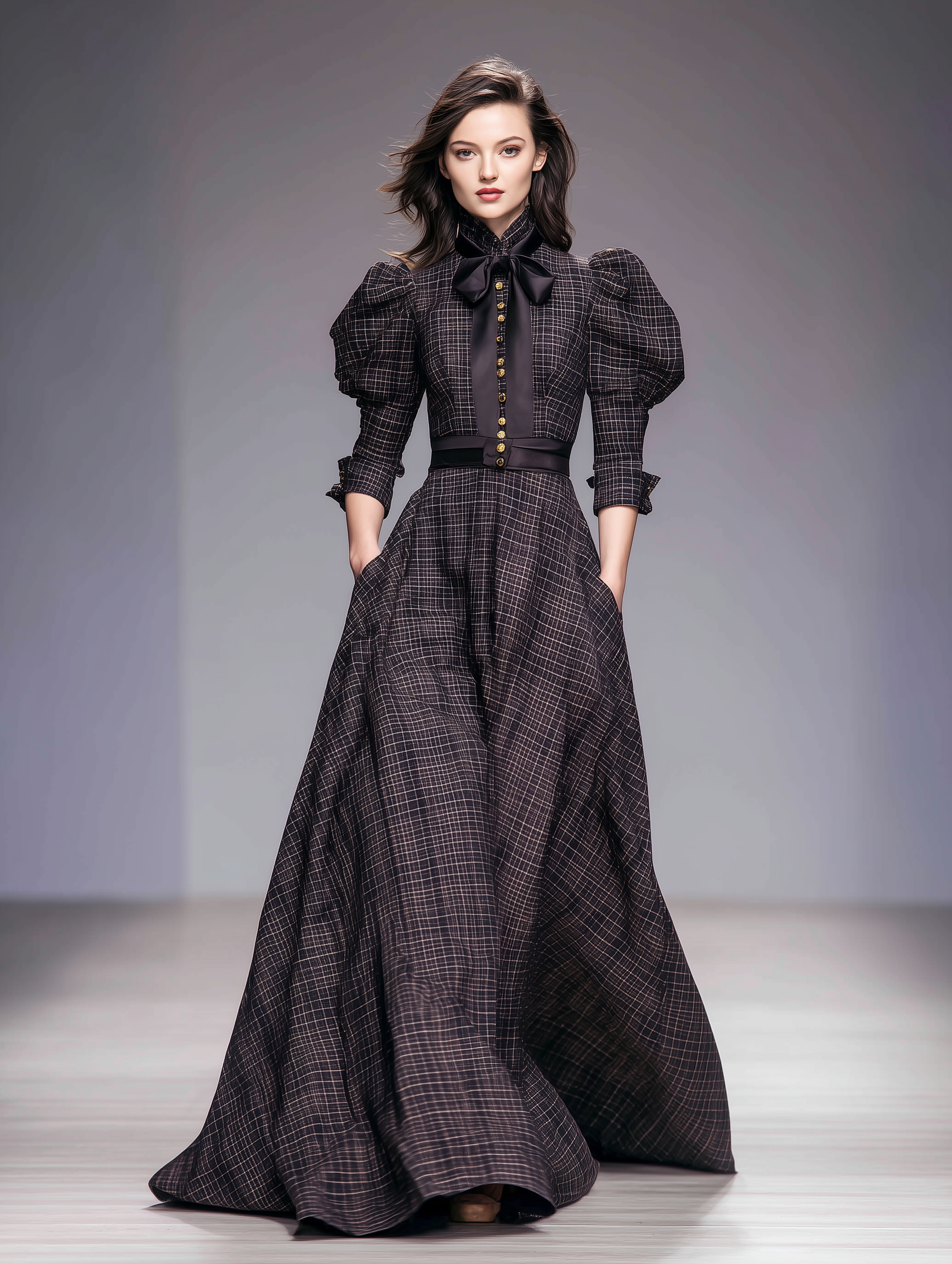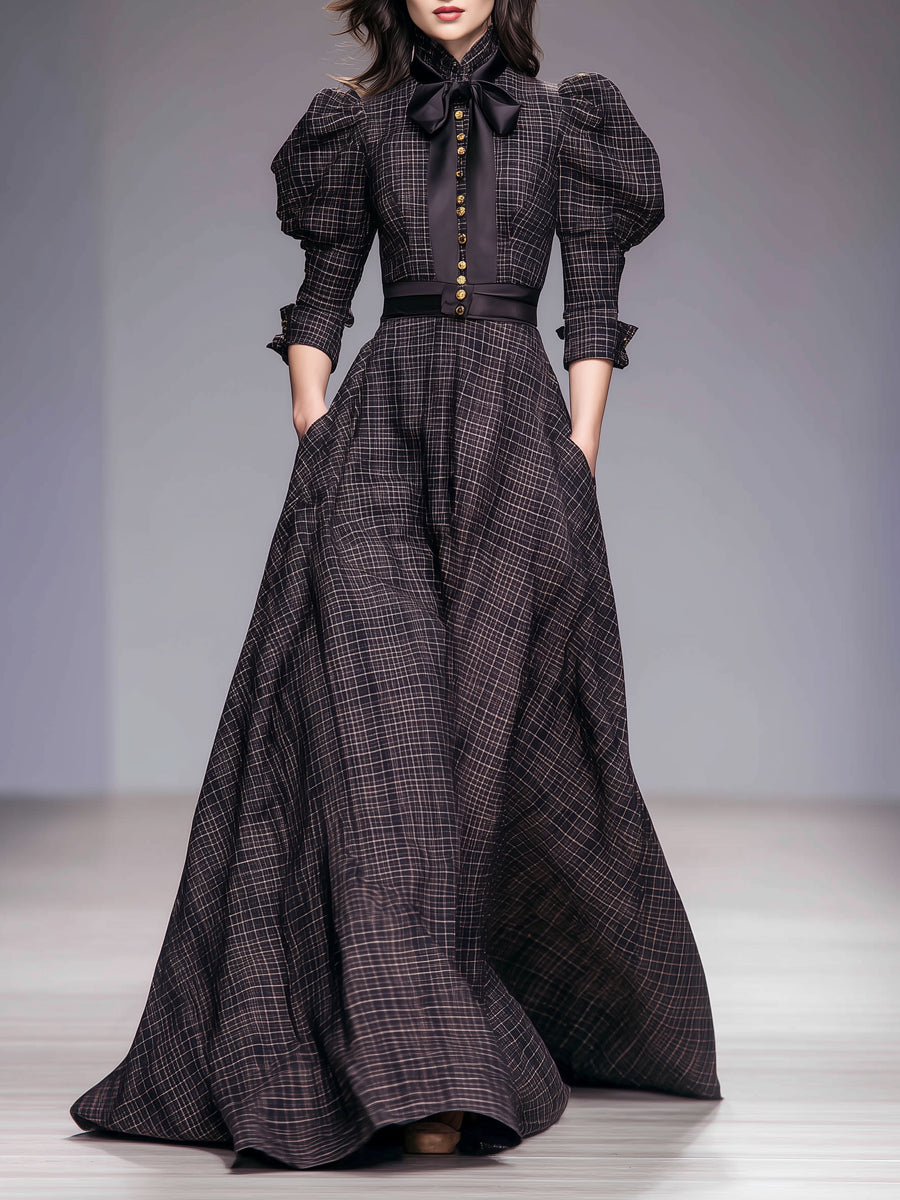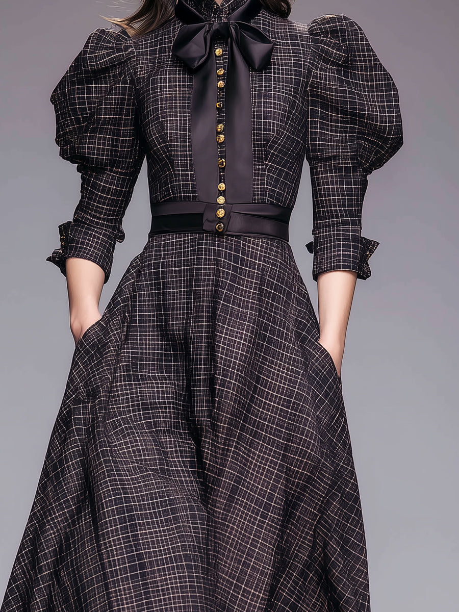 This stylish long dress features a charming blend of modern fashion and classic elegance. The dress showcases a sophisticated plaid pattern that's versatile and chic. Designed with distinctive leg of mutton sleeves and a half-high neckline, it offers a unique silhouette that accentuates your figure. The tie bow detail adds a touch of femininity, making it a perfect choice for various occasions.