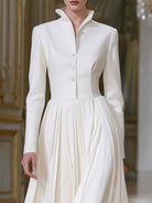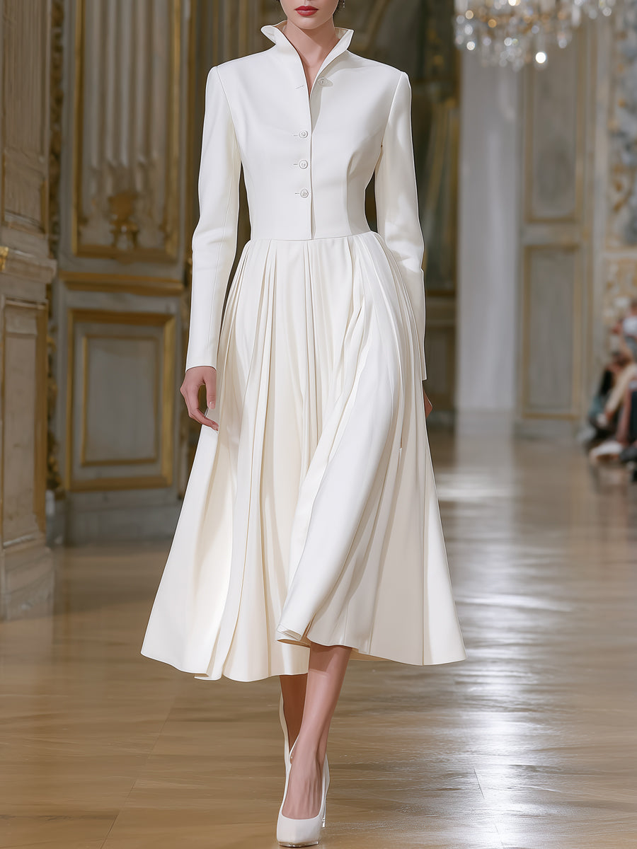 This Women's Small Stand-up Collar Umbrella Skirt Dress features a minimalist design that brings elegance and sophistication to any outfit. The dress is crafted in a vanilla white shade, adding a touch of classic purity to its overall appearance. Its stand-up collar and umbrella skirt design exude a sense of both gracefulness and modernity, making it suitable for a variety of occasions.