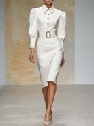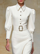 Our Women's Solid Color Office Puff Sleeve Elegant Midi Dresses offer a timeless piece that enhances your wardrobe with its sophisticated and versatile design. Its sleek style and quality craftsmanship make it an essential dress that you'll reach for time and time again.