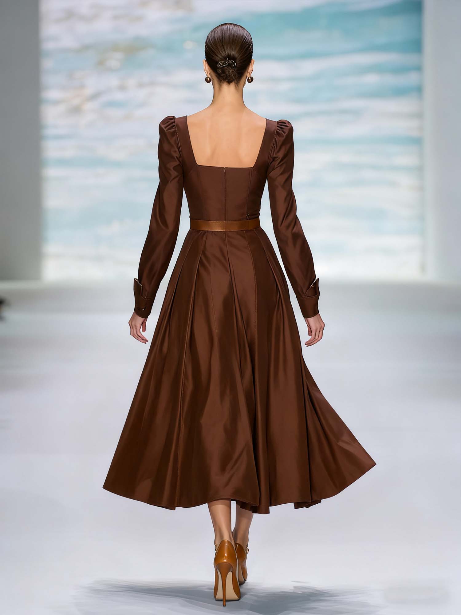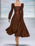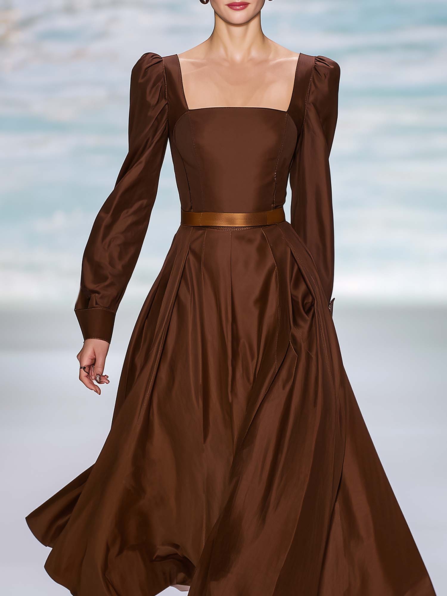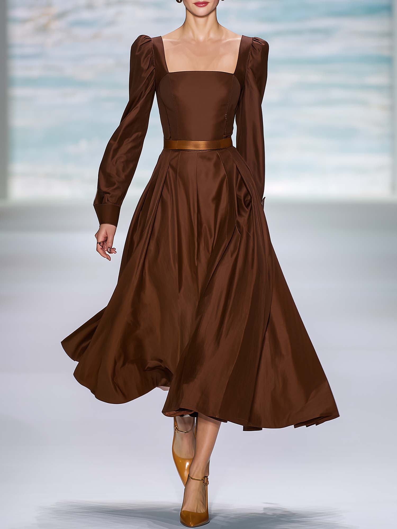 Women's Solid Color Square Neck Long Sleeve Midi Dress