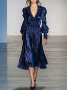 Women's Solid Color V-Neck Elegant Puff Sleeve Midi Dress