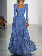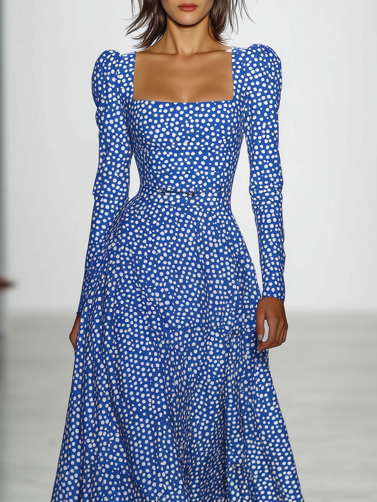 Women's Square Neck Polka Dot Print Long Sleeve Maxi Dress