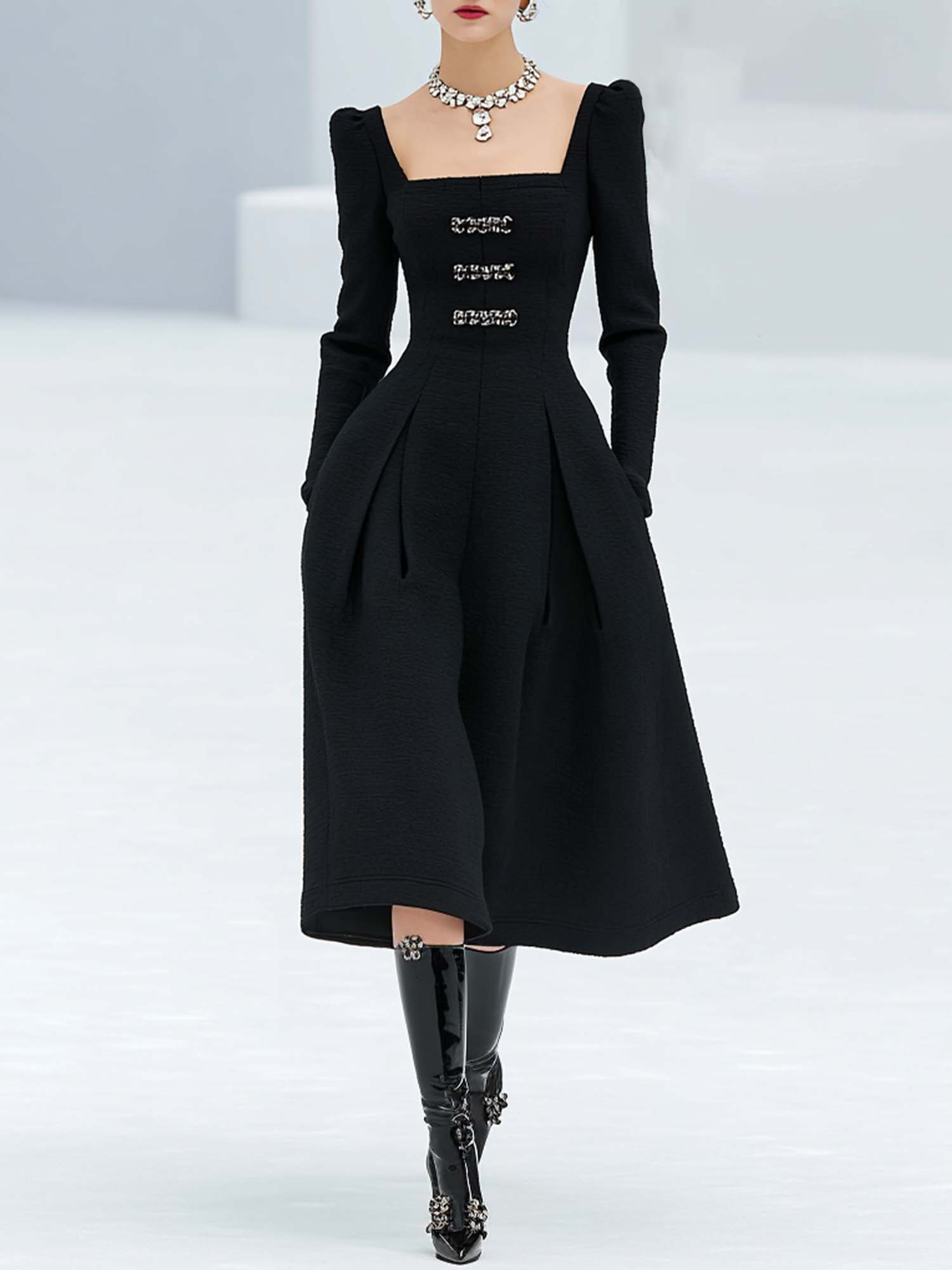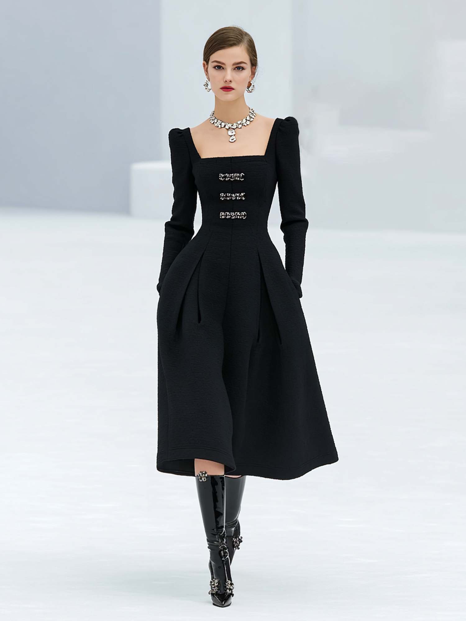 • Design: The dress features a chic square neckline, adding a modern twist to the classic dress silhouette.
