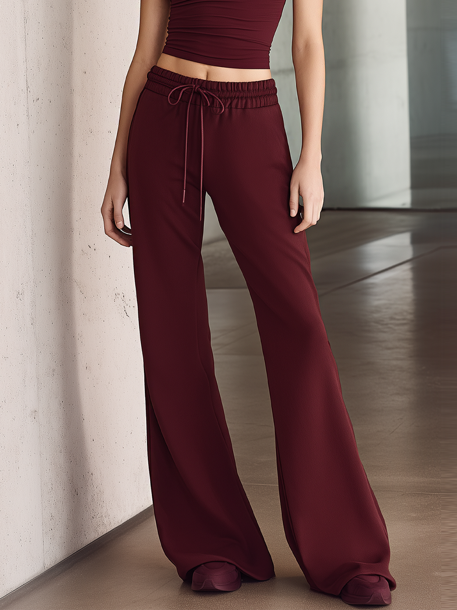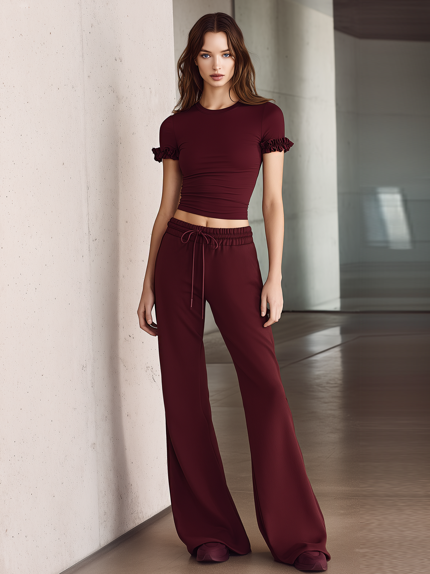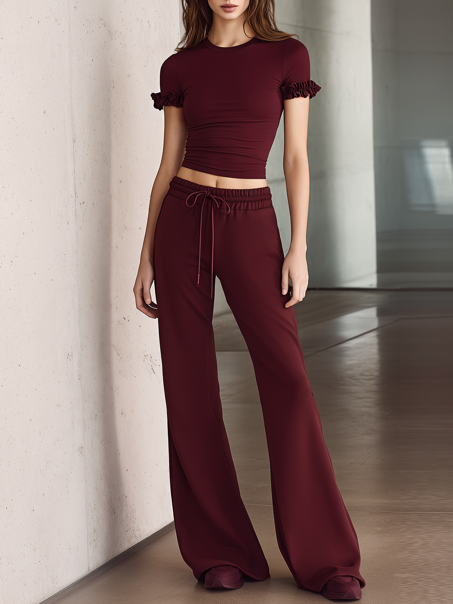 This two-piece set features a rich burgundy hue and a modern yet feminine silhouette. The top is designed with delicate ruffled sleeves that add movement and charm, while the matching flared pants create a balanced, elongating line. Crafted to be versatile and comfortable, the suit transitions effortlessly from relaxed daytime wear to a polished evening look.